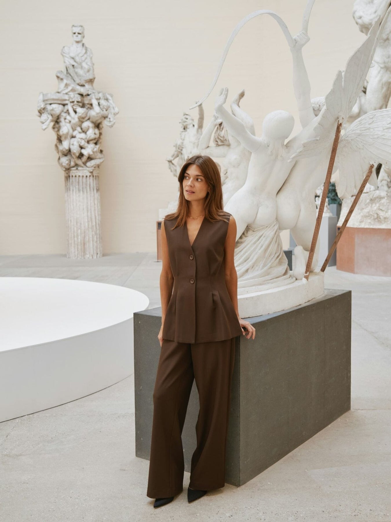 Mørkebrune bukser fra Neo Noir i tykt stoff. De har en høy midje og en løs passform med vide ben som går helt ned til gulvet. Buksene kan brukes til både hverdag og fest.