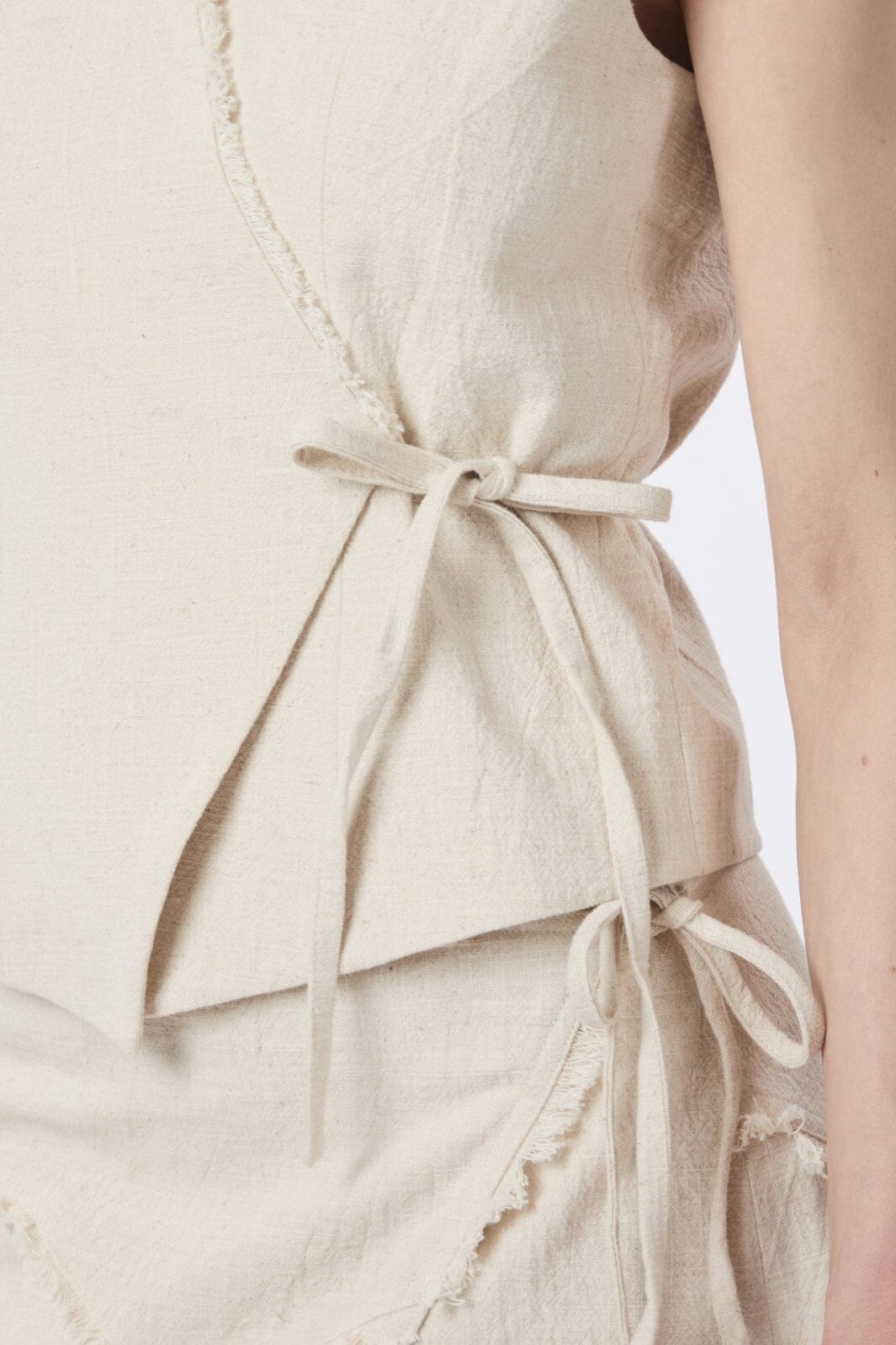Ermeløs vest fra Neo Noir i en lys beige nyanse. Vesten har et wrap-design med v-hals og bindedetalj i siden. Frynser langs kantene gir vesten et rustikt preg.