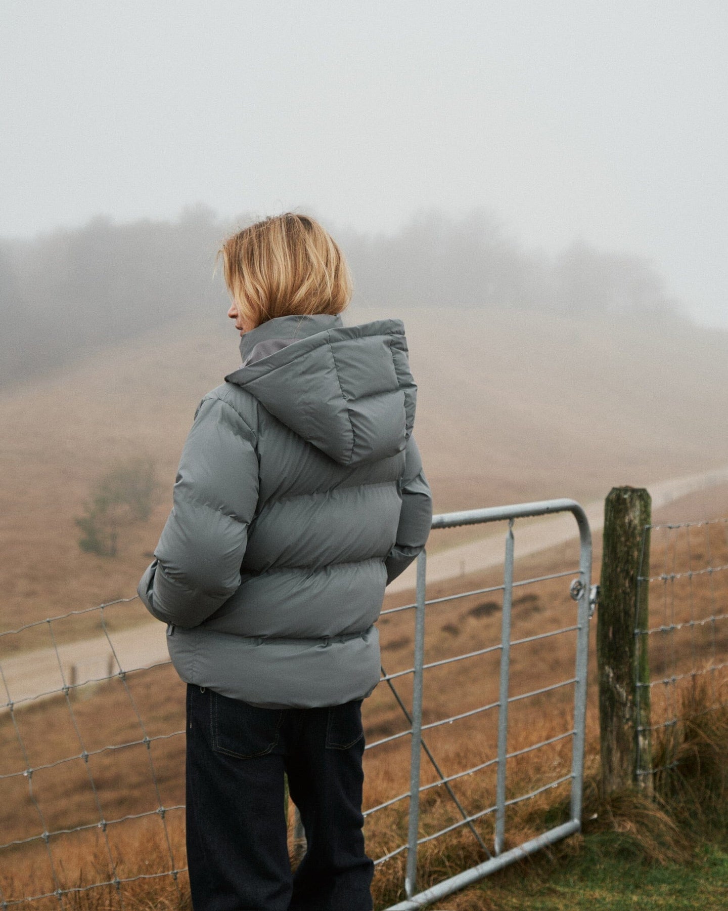 Cool vattert jakke som er vannavvisende. Kvaliteten er myk og matt og gir et kult utseende. Jakken er kort og har avtagbar hette og justerbar vidde nederst. Modellen er 176 cm og har på seg størrelse 36.