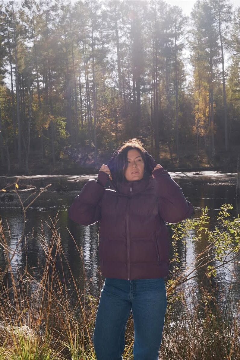 Cool vattert jakke som er vannavvisende. Kvaliteten er myk og matt og gir et kult utseende. Jakken er kort og har avtakbar hette og justerbar vidde nederst. Modellen er 176 cm og har på seg størrelse 36.