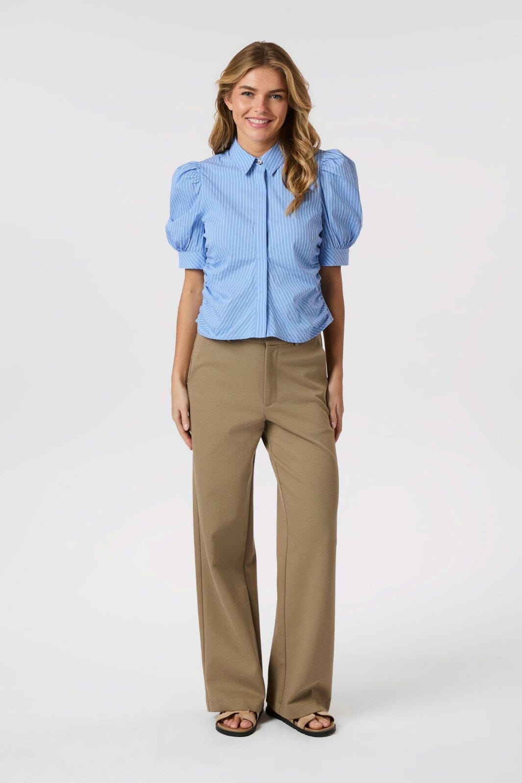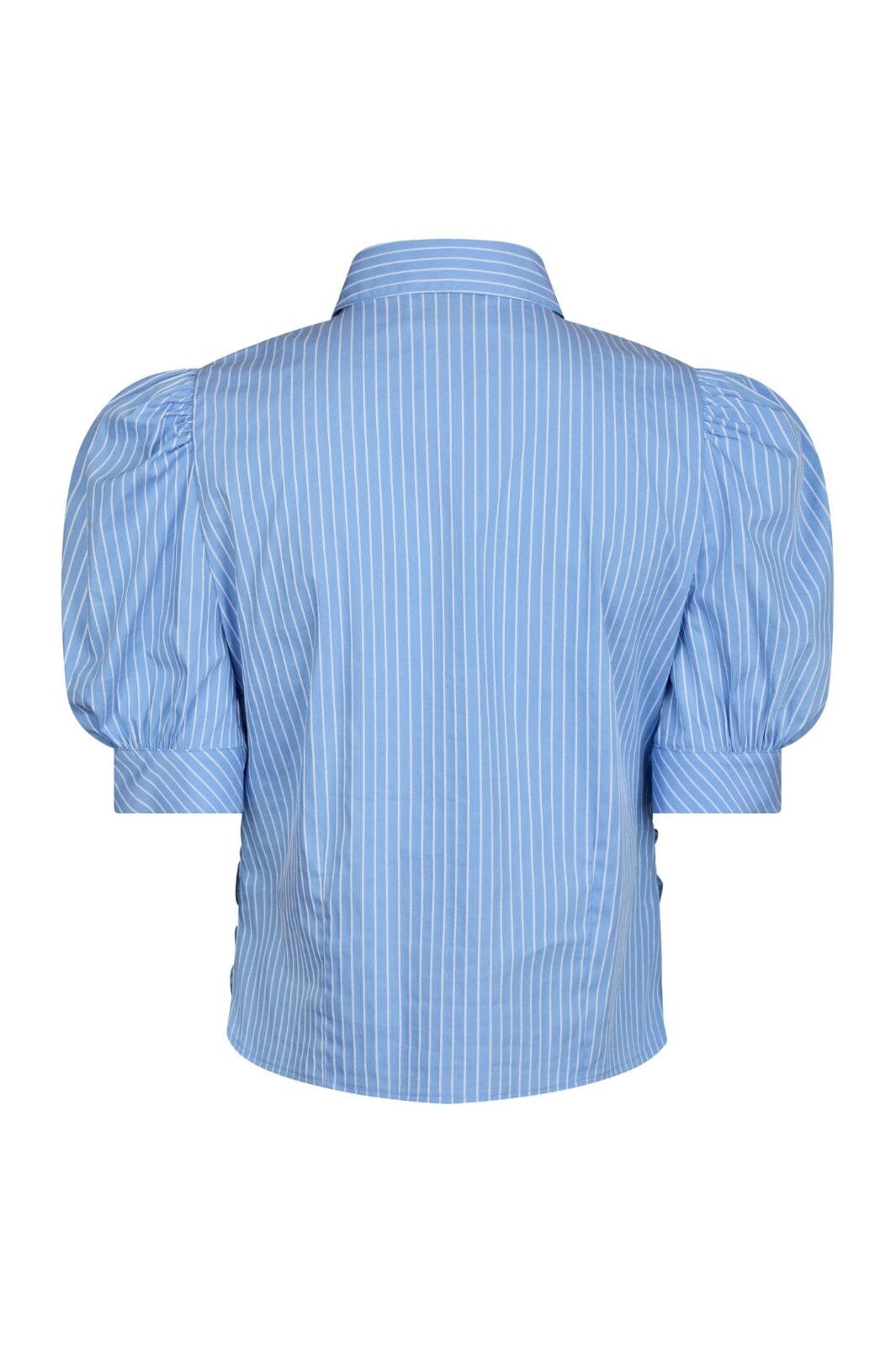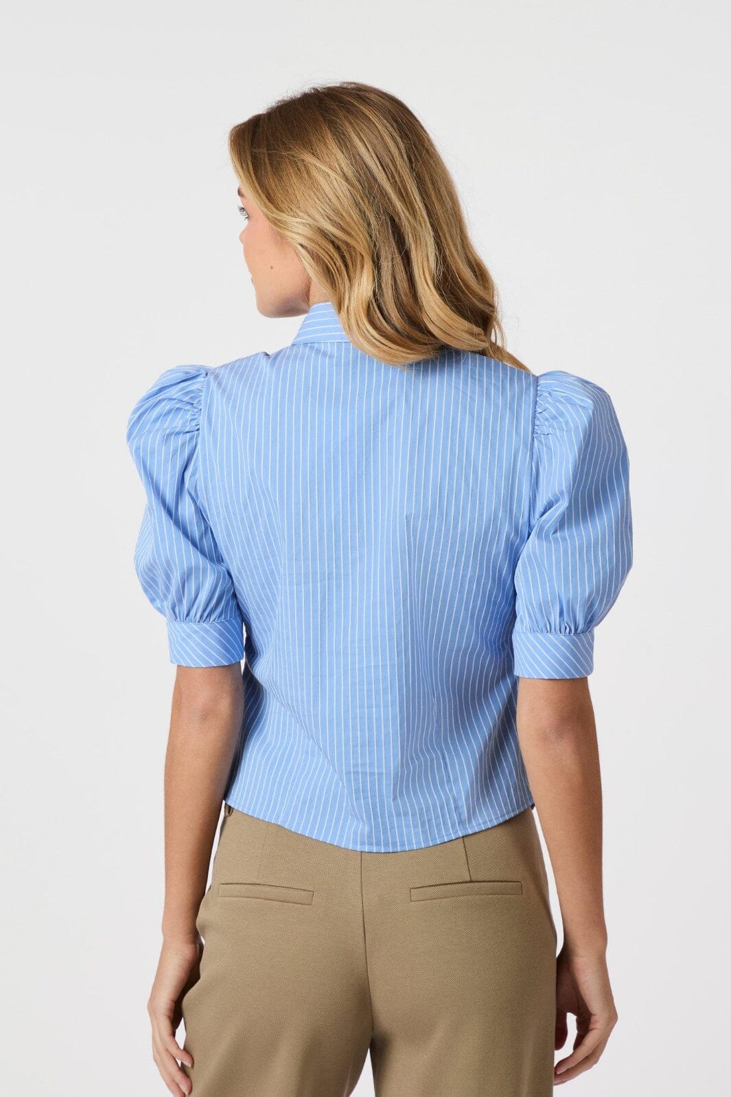 Stripet skjorte fra Neo Noir i lyseblå. Den har puffede korte ermer og en skjortekrage med dekorativ knapp. Skjorten har en slank passform med striper.
