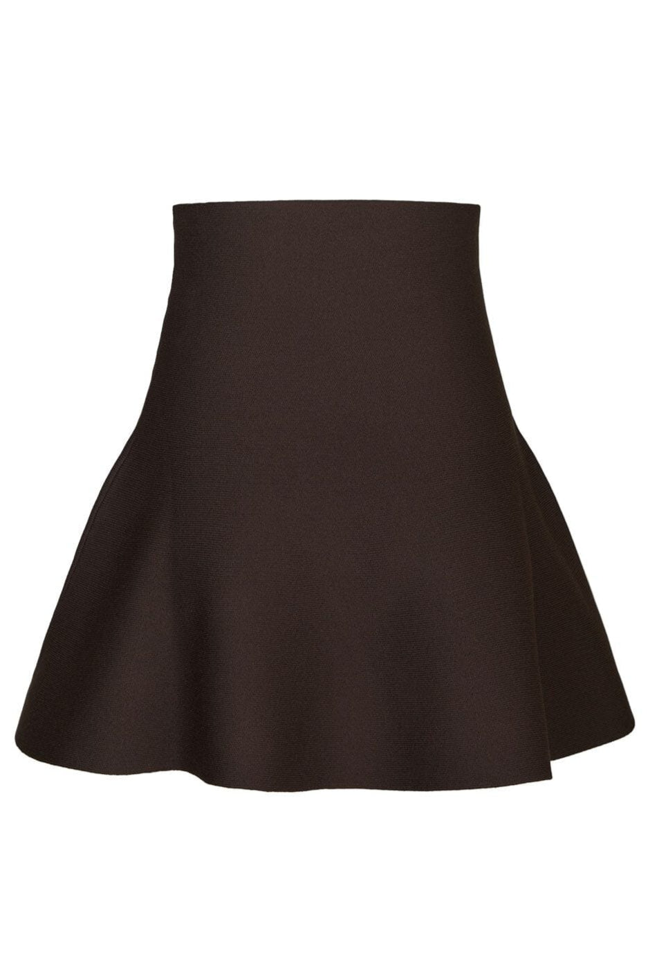 Kort skjørt i strikk, som sitter i midjen og har vidde nederst. Modellen er 176 cm høy og har på seg størrelse 36.