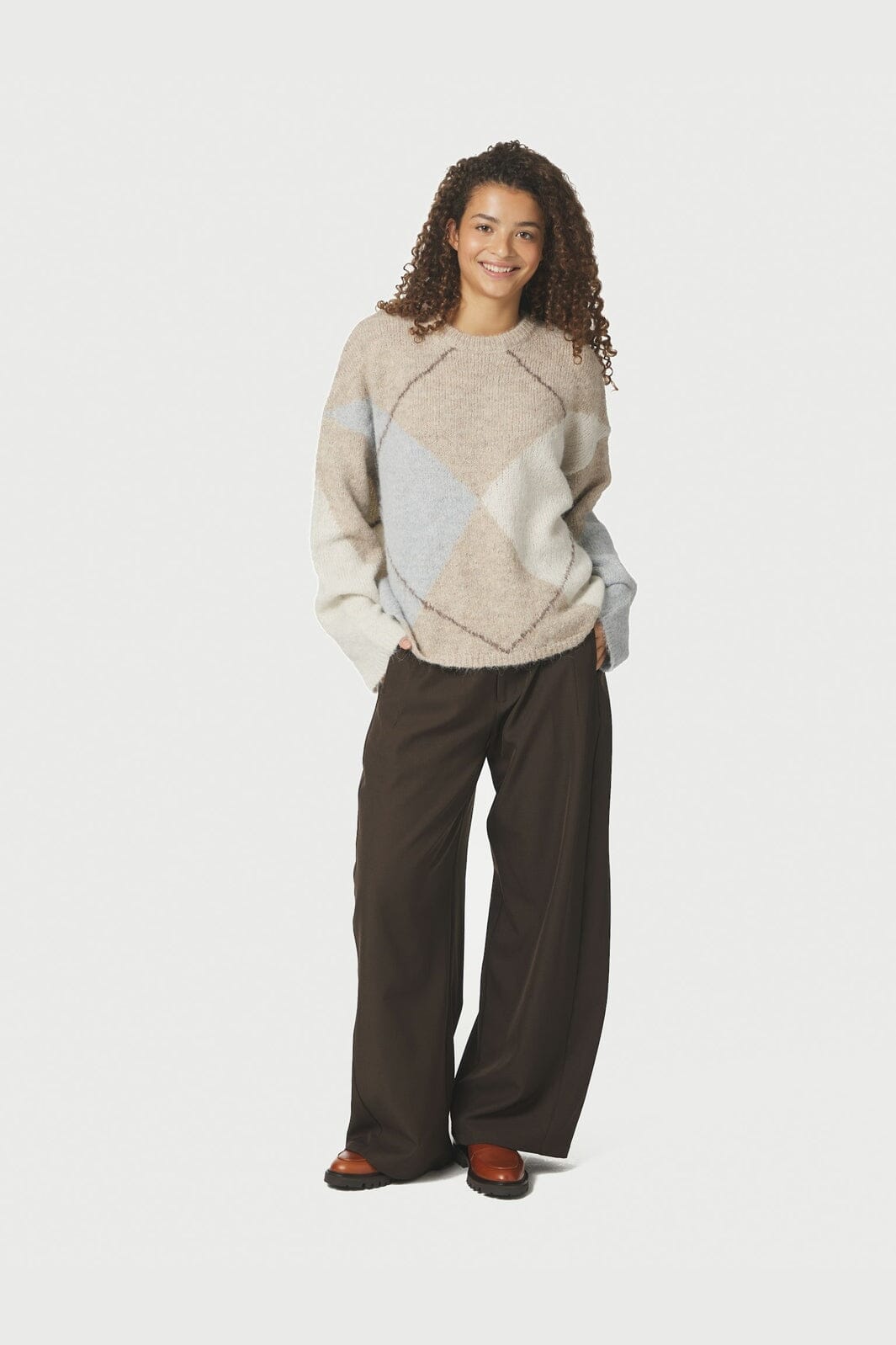 Strikket bluse fra Neo Noir med et rutet argyle-mønster i beige, lyseblått og hvitt. Blusen har en myk kvalitet med et fluffy utseende.
