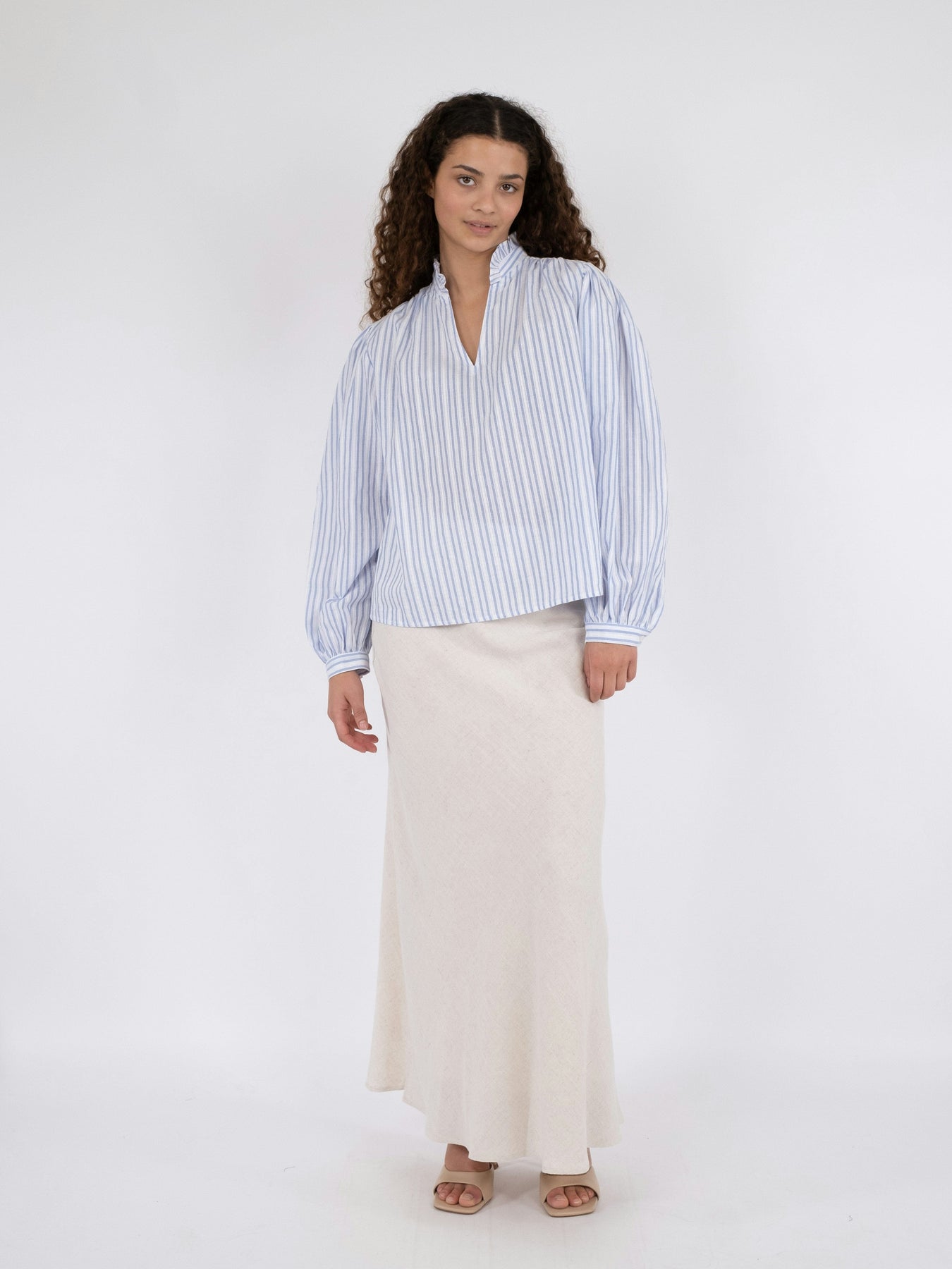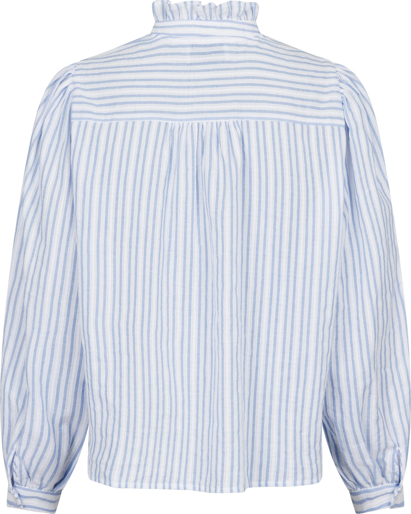 Stripet bluse fra Neo Noir i lyseblått og hvitt. Blusen har pufferm og en v-hals med volangdetaljer. Den løse passformen gir god bevegelsesfrihet.