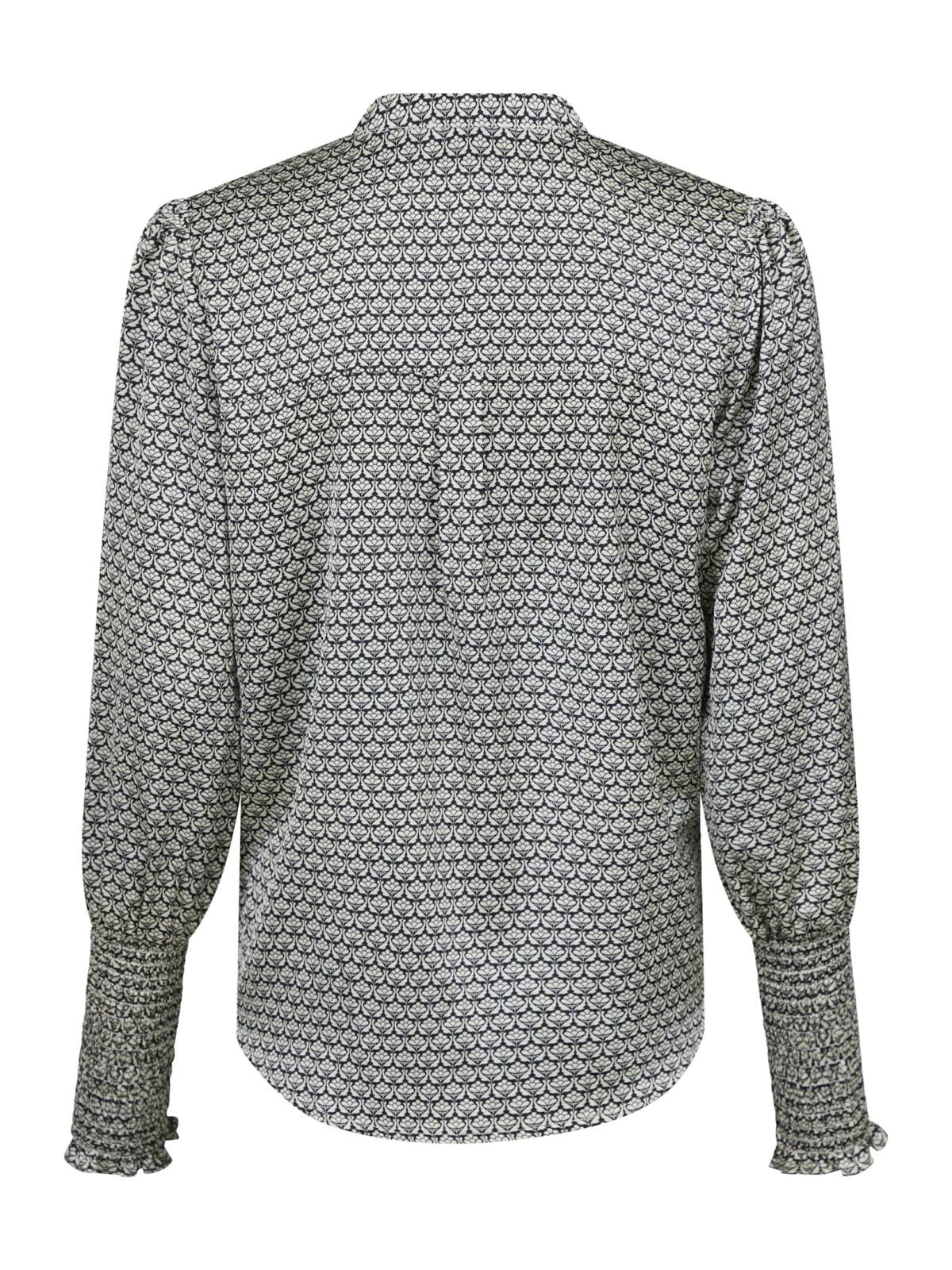 Svart bluse fra Neo Noir med grafisk mønster. Blusen har lange ermer med smockmanchetter og en åpen V-hals. Det grafiske trykket i svart og hvitt gir et rent og moderne utseende.