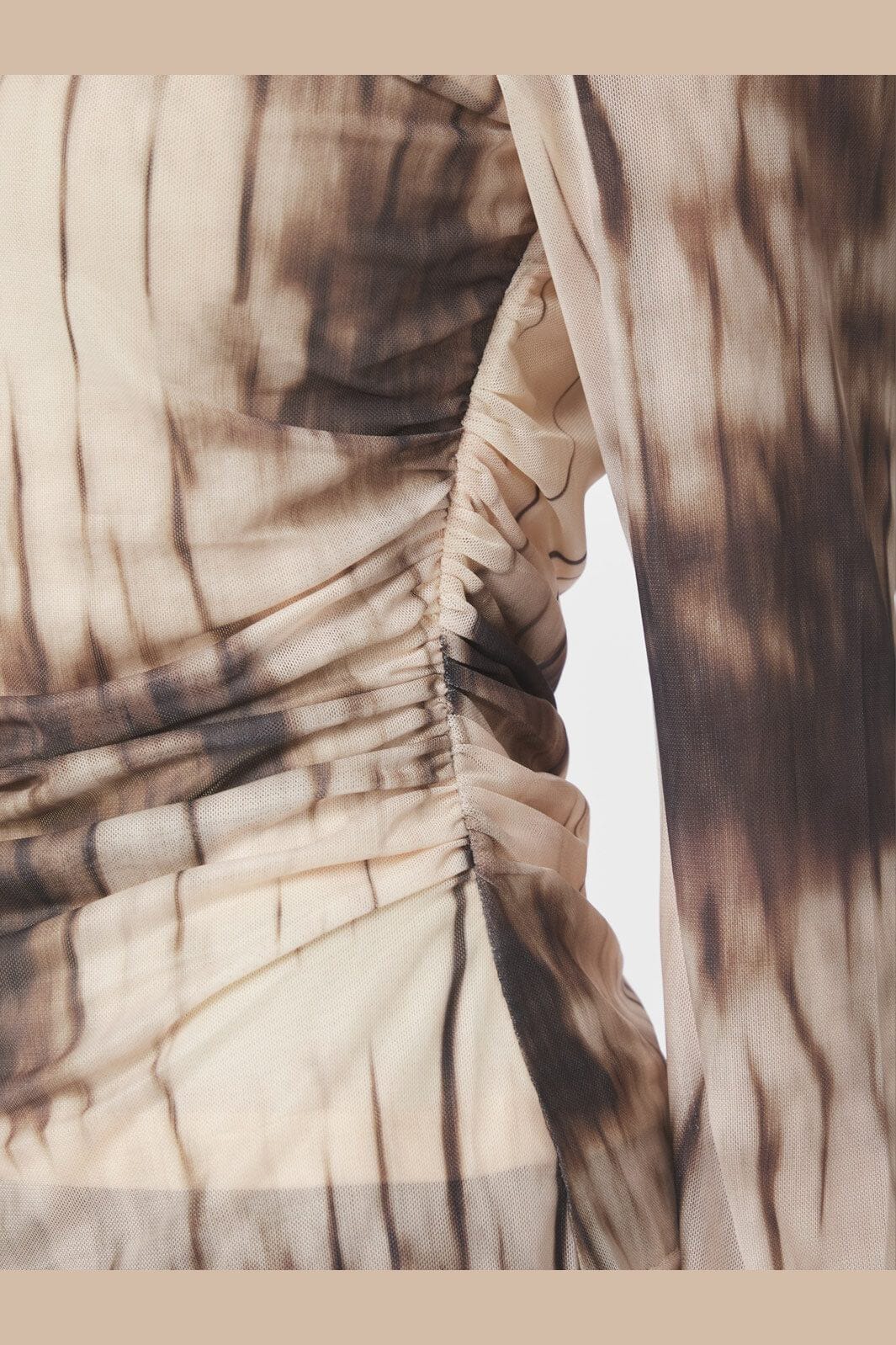 Meshbluse fra Neo Noir i brun nyanse med et falmet print. Blusen har rynkedetaljer ved midjen og lange ermer med vidde.