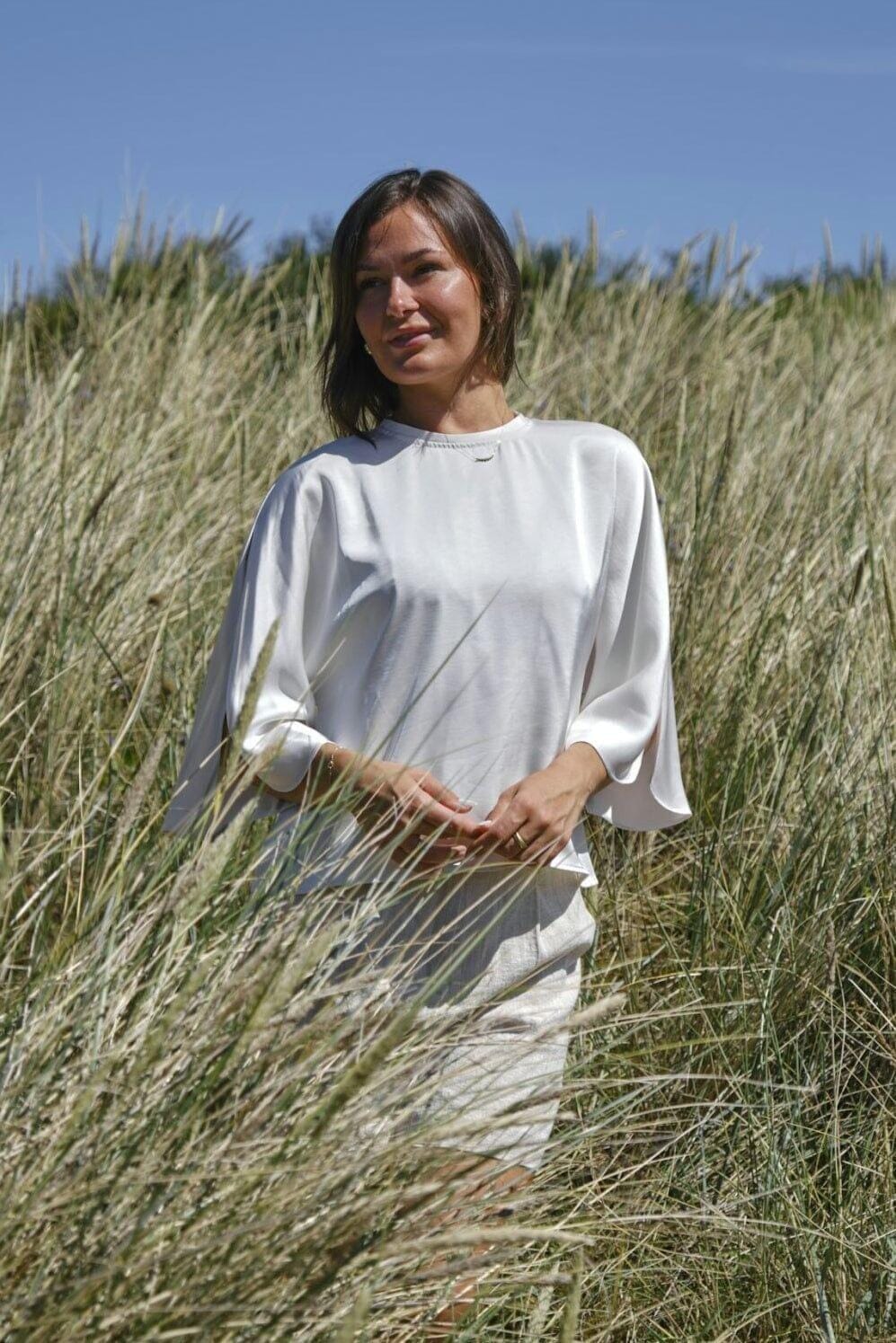 Satinbluse fra Neo Noir i en lys perlefarve. Blusen har brede ermer med slisser og en rund halsutskjæring med nøkkelhullsdetalj i nakken.