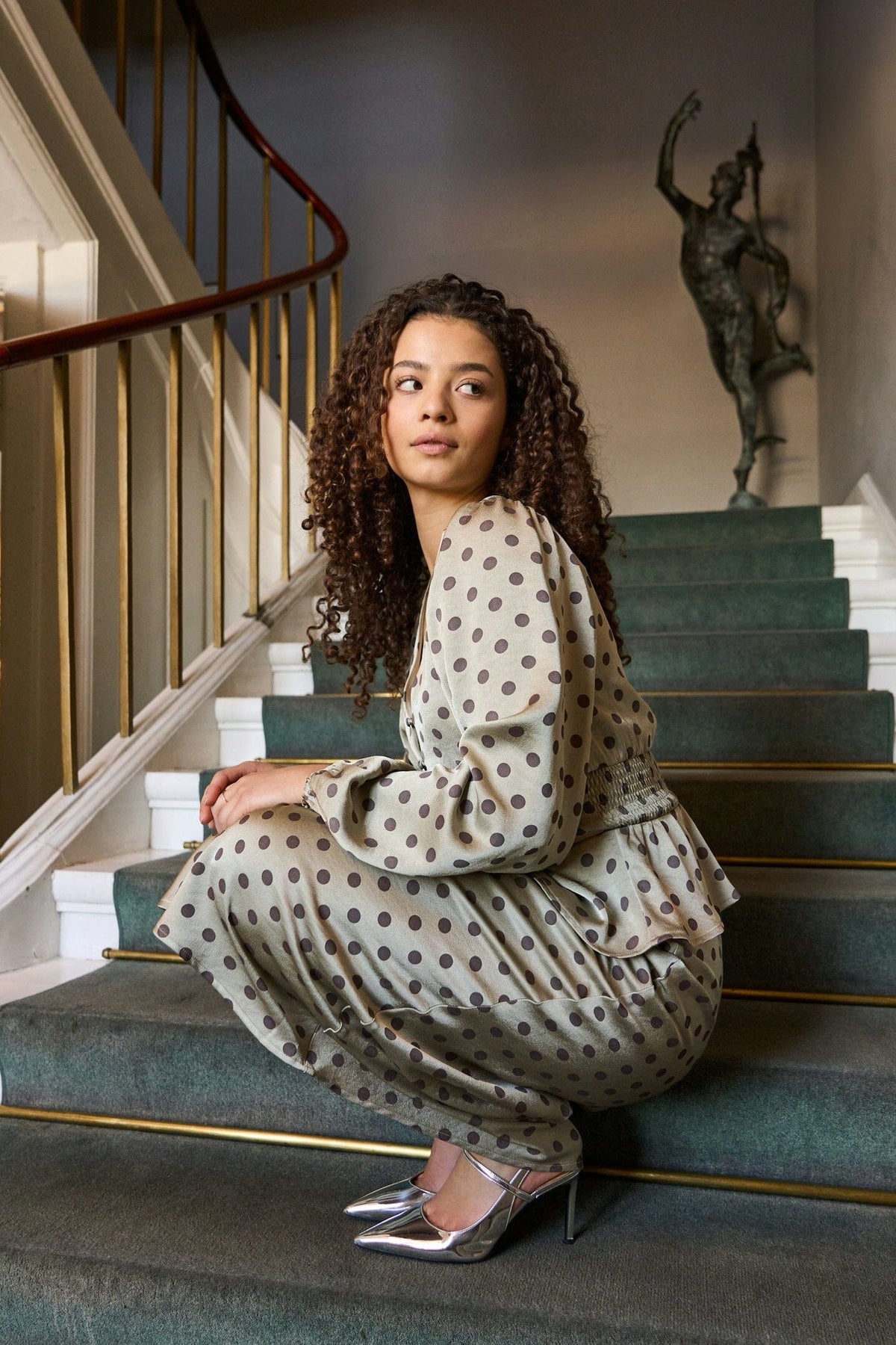 Skjørt fra Neo Noir i lysegrønn med mørke prikker. Skjørtet har en lang lengde til anklene og passer til både fest og hverdag.