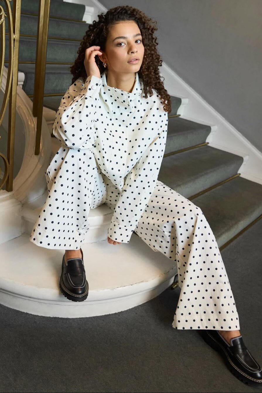 Hvite bukser fra Neo Noir med svarte prikker. Buksene har høyt liv og gulvlengde med løs passform og vide ben.
