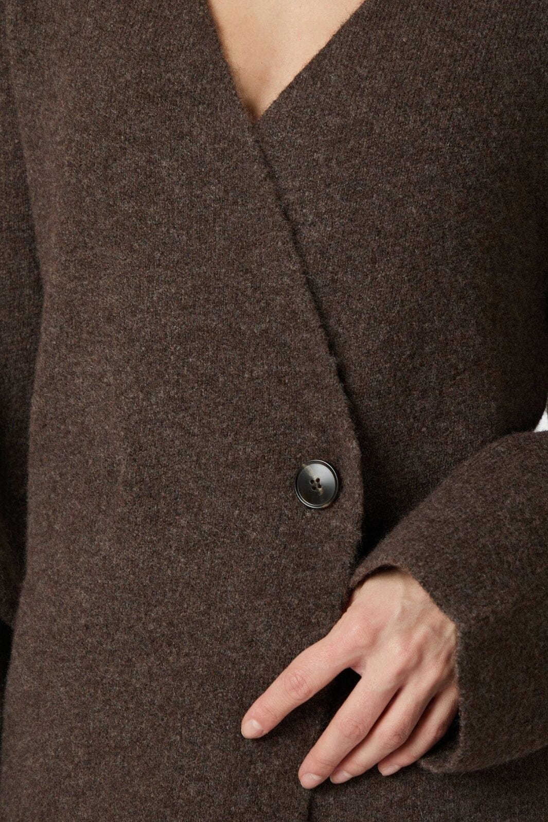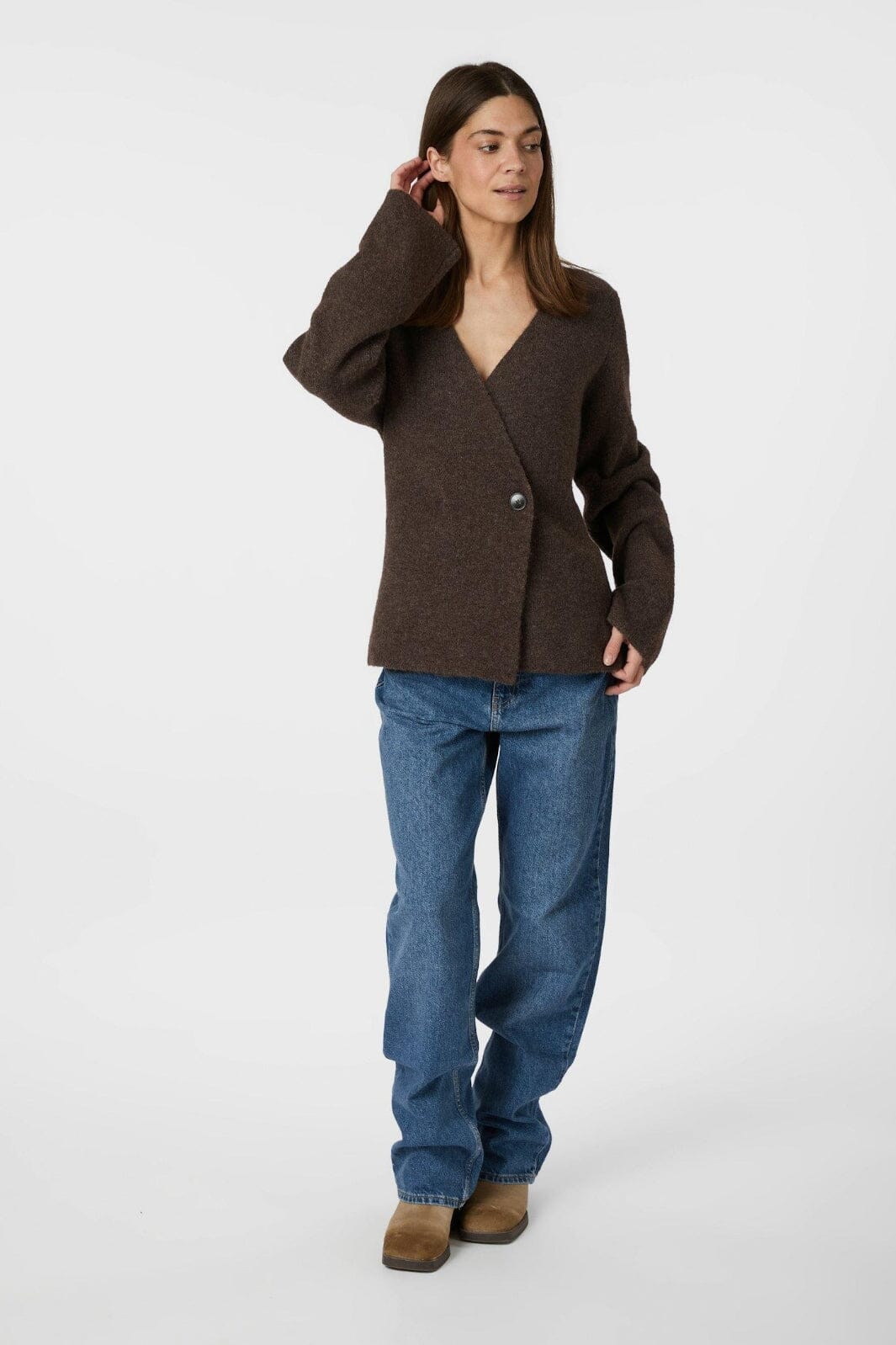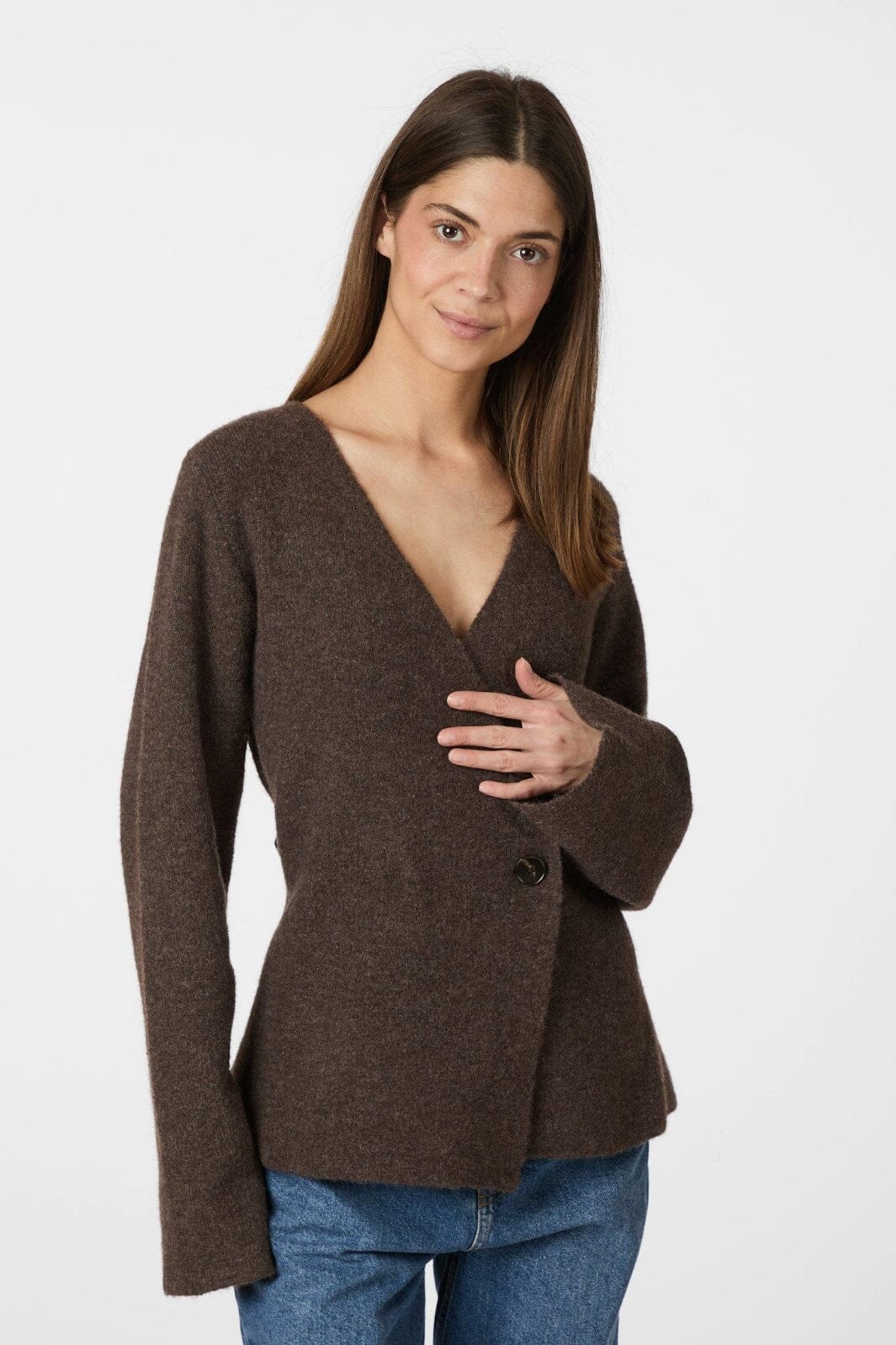 Cool strikket cardigan, som kommer i en myk kvalitet. Cardiganen har timeglassform for et feminint utseende. Modellen er 176 cm og har på seg størrelse 36.