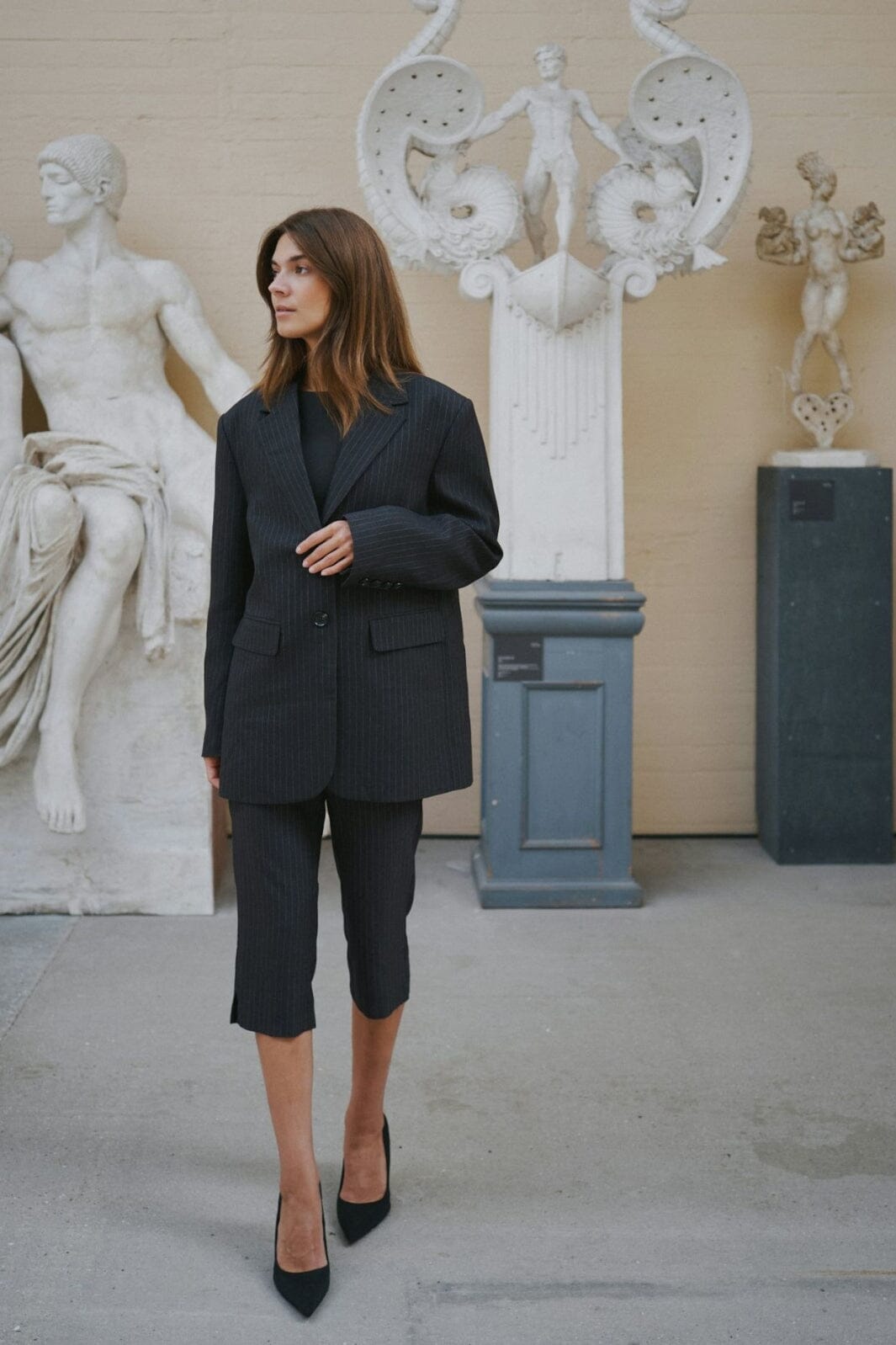 Antrasittfarget blazer fra Neo Noir med nålestripet mønster. Den har en oversized passform og knapper både foran og på ryggen. V-utringning og lange ermer gir blazeren et klassisk snitt.