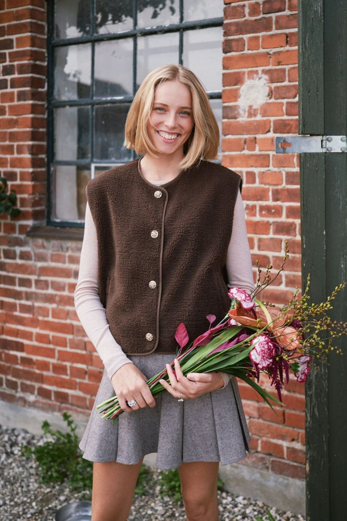 Mørkebrun teddyvest fra Neo Noir med rund halsutskjæring. Den myke og fluffy teddy-teksturen gir vesten et varmt og innbydende uttrykk.