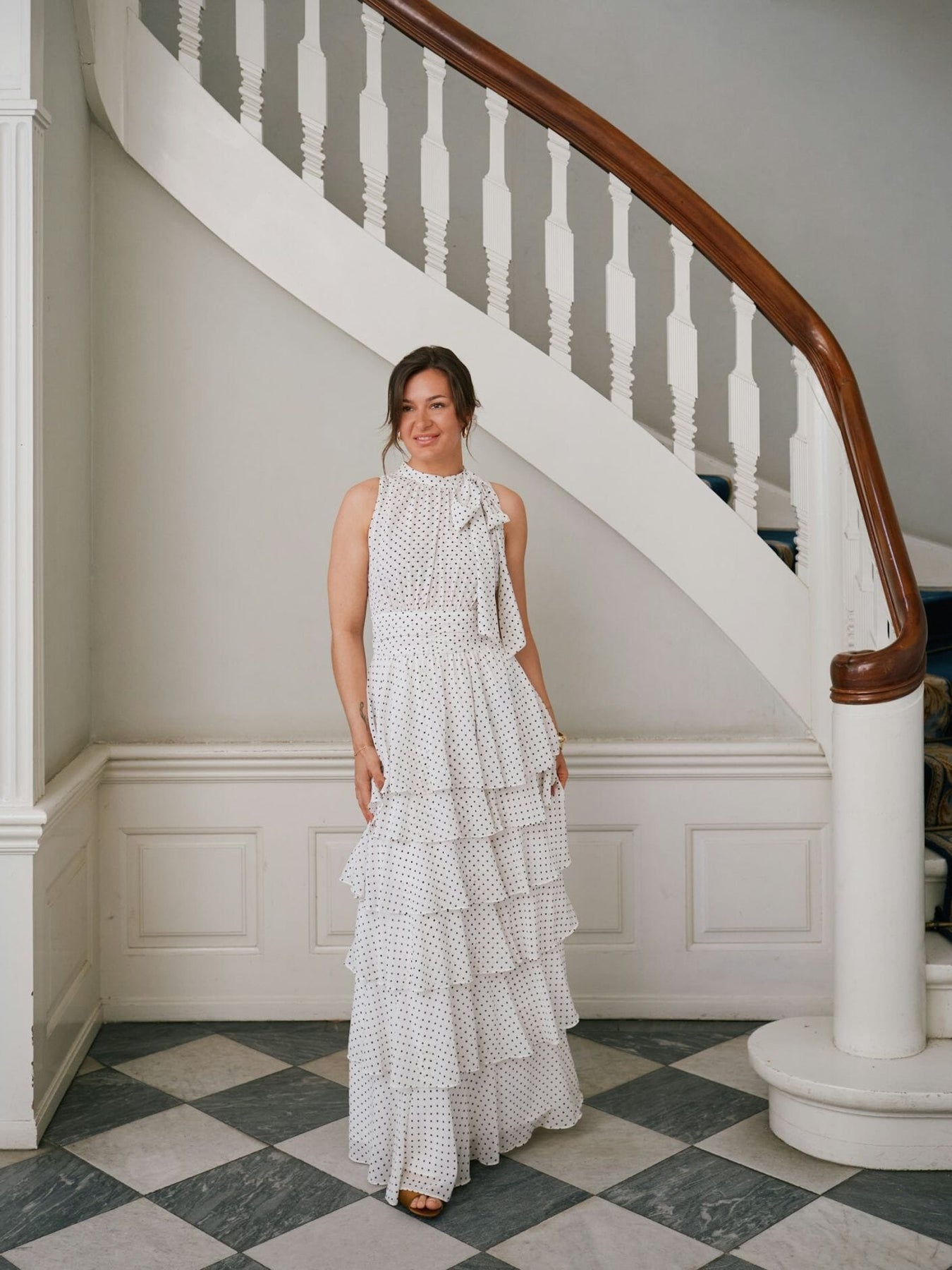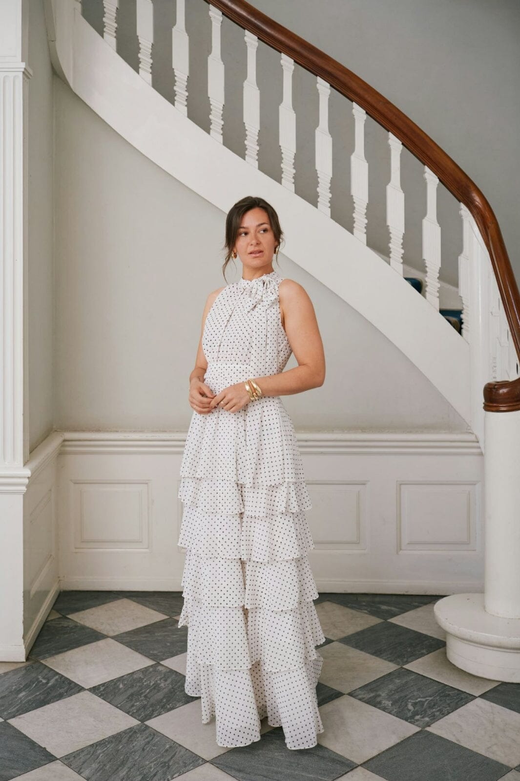 Hvit gulvlengde kjole fra Neo Noir med svarte prikker. Kjolen har høy hals med bindebånd og smock under bysten. De mange volanglagene gir en myk fall.