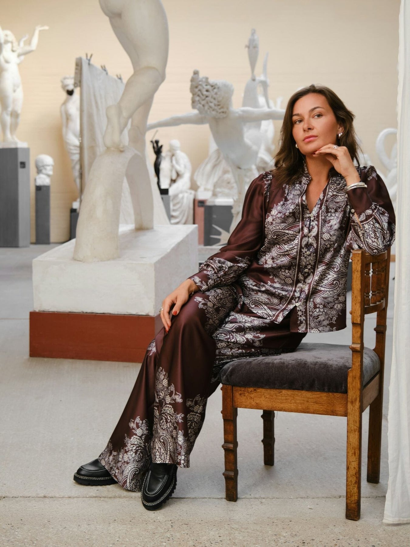 Mørkebrun bluse fra Neo Noir med paisley-mønster i lysere nyanser. Blusen har V-utringning med knappelukking og lange ermer med volangdetaljer.