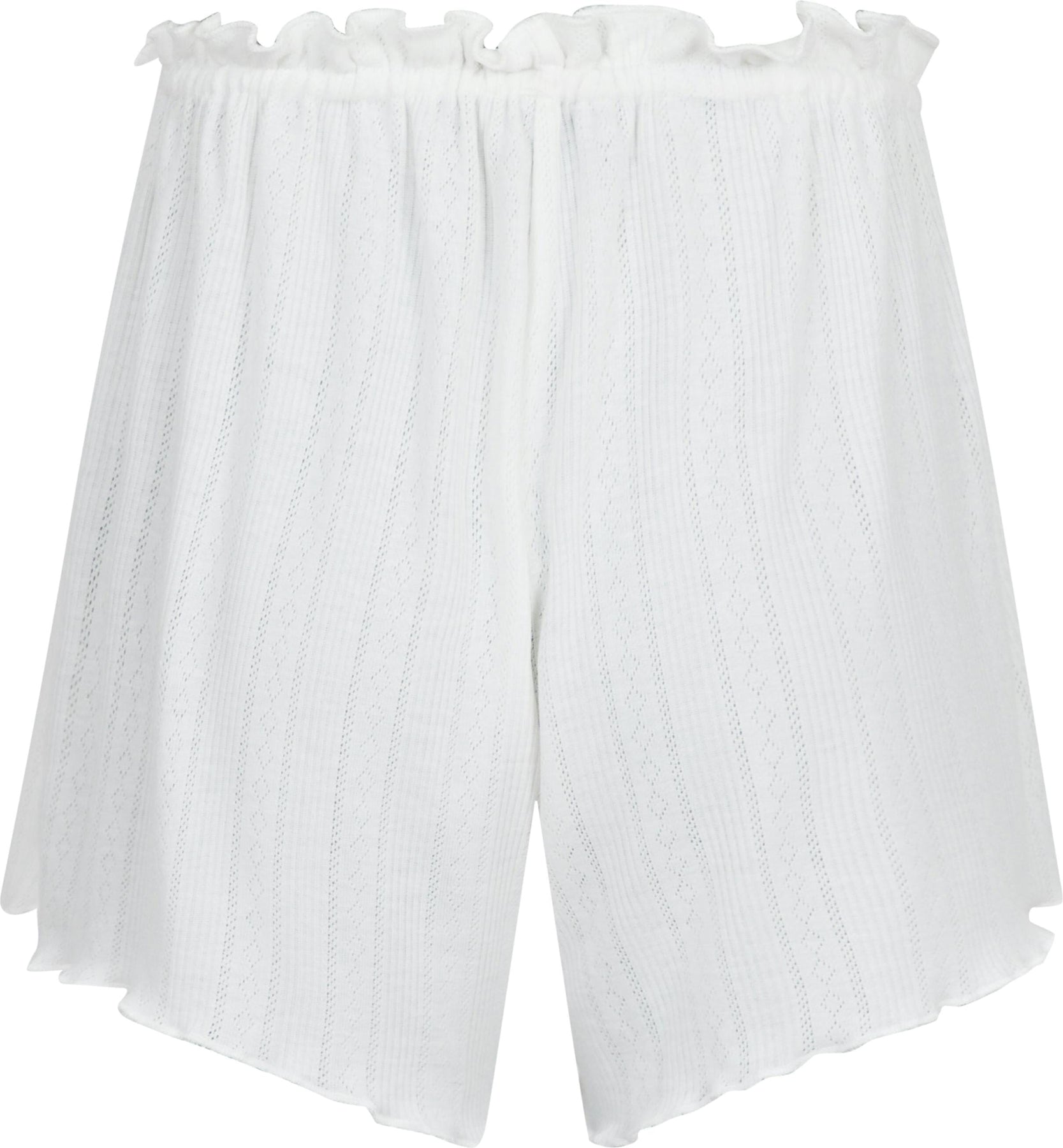Fine shorts med volangkant og snørebånd, kommer i en deilig pointellekvalitet. Modellen er 176cm og har på seg en størrelse 36.