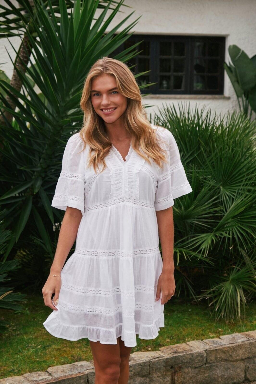 Hvit voilekjole fra Neo Noir med blondebånd og volangdetaljer. Kjolen har korte ermer og V-hals med rynkede detaljer langs sømmene.