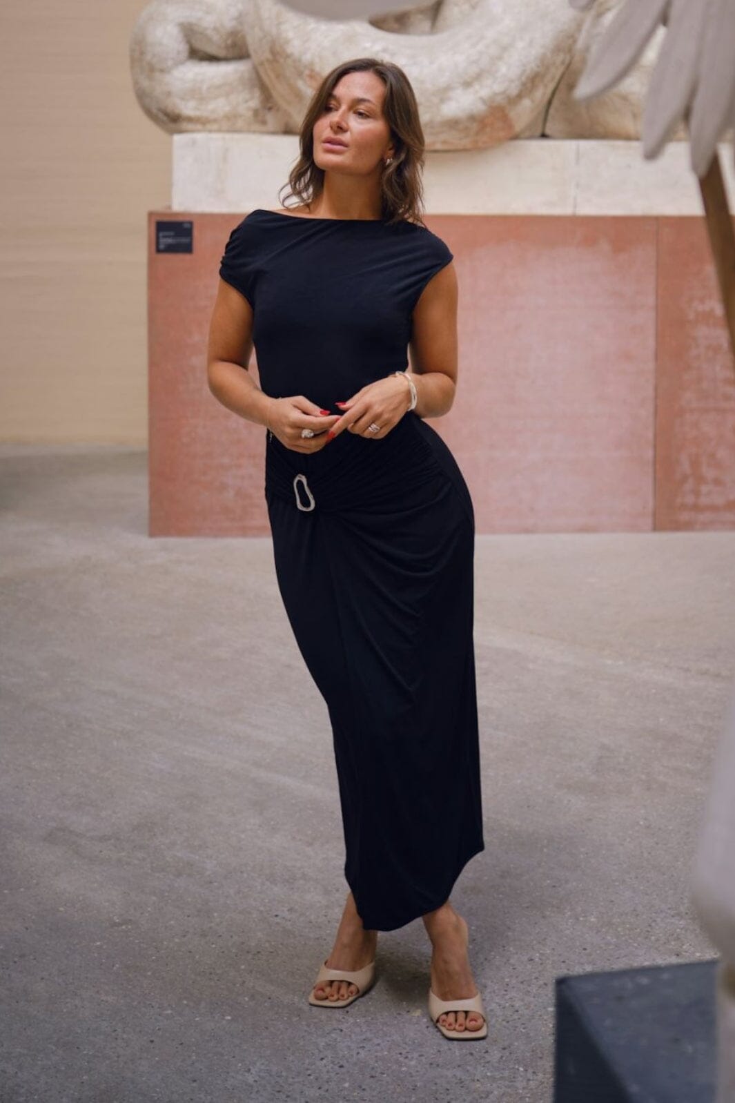 Svart kjole fra Neo Noir med drapering i midjen og sølvspenne. Kjolen har korte ermer, rund hals og rekker til midt på leggen. Den slanke passformen følger kroppens linjer.