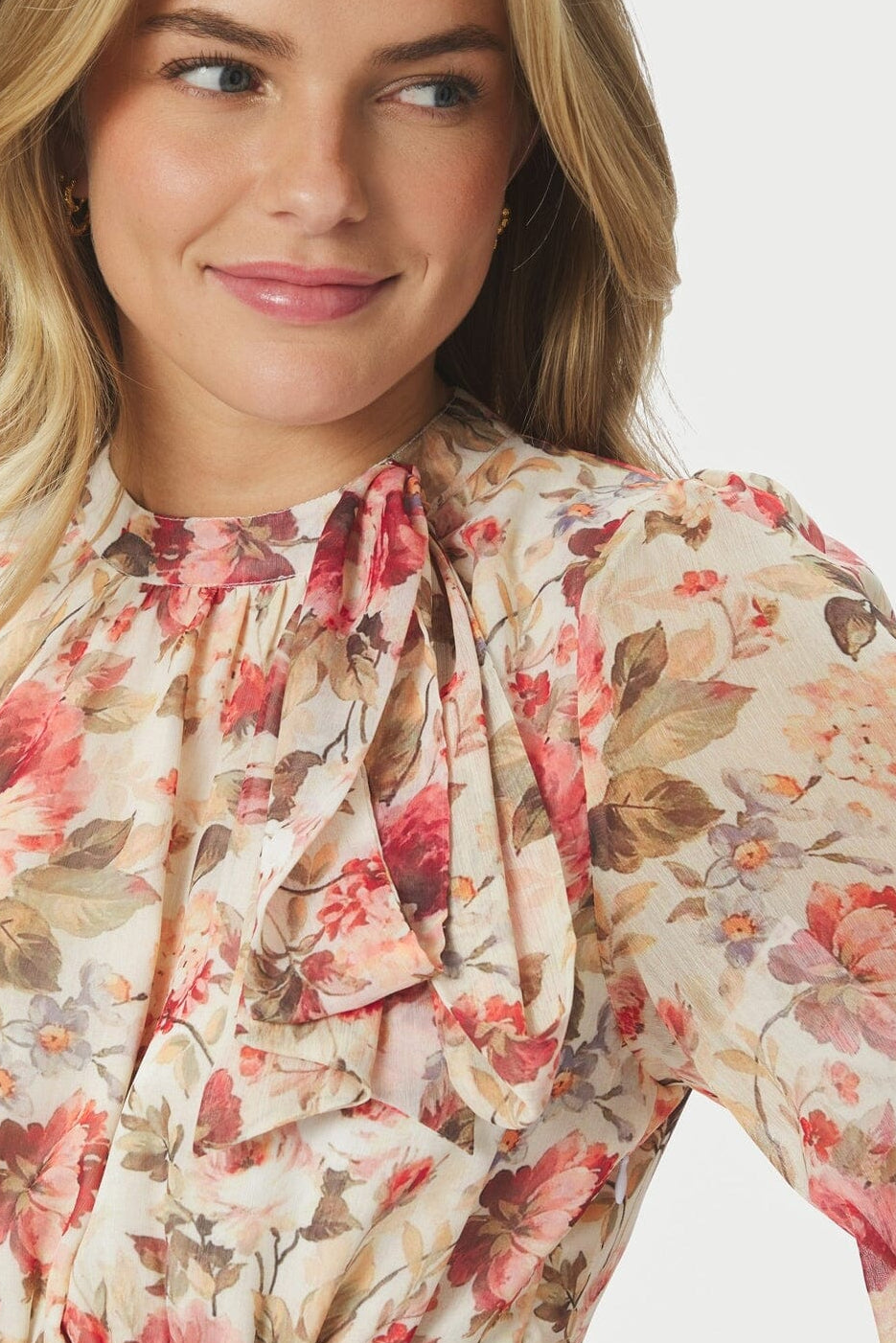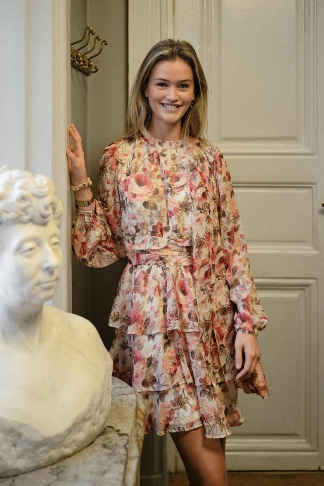 Kjole fra Neo Noir med blomsterprint i krem- og røde nyanser. Den har høy hals med knytedetalj, lange ermer og en løs passform.