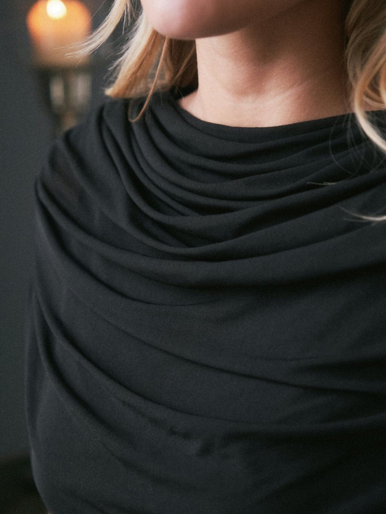 Sort meshkjole fra Neo Noir med drapert design. Kjolen har rynker langs sidesømmen og en vannfalleffekt foran, som skaper bevegelse i stoffet.