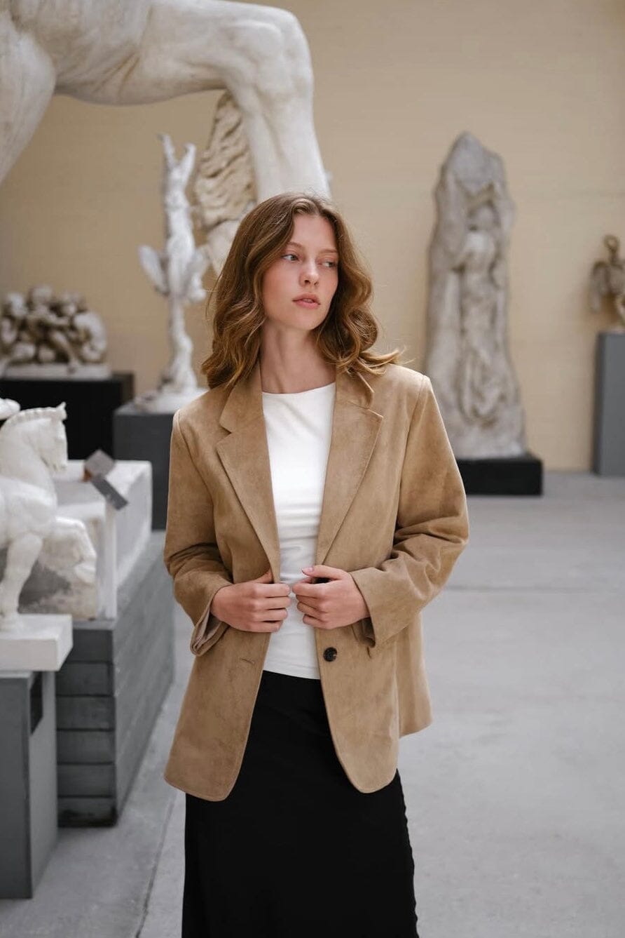 Sandfarget blazer fra Neo Noir i imitert semsket skinn. Den har en spiss krage og to knapper foran. Blazeren kommer med forlommer og en regular fit-passform.