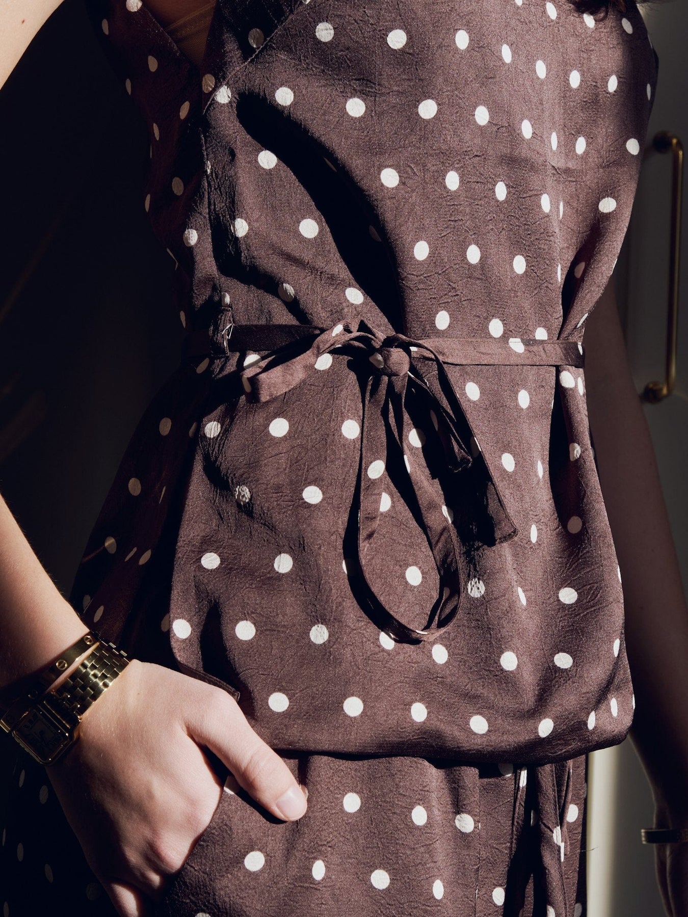 Mørkebrun topp fra Neo Noir med hvite prikker. Toppen er laget av 100 % polyester og har en tettsittende passform.