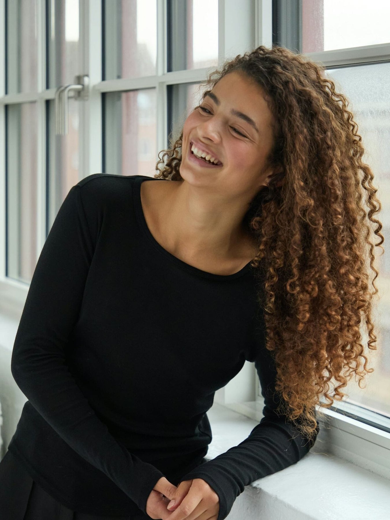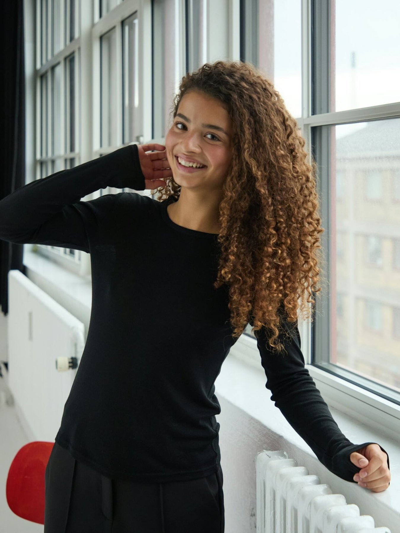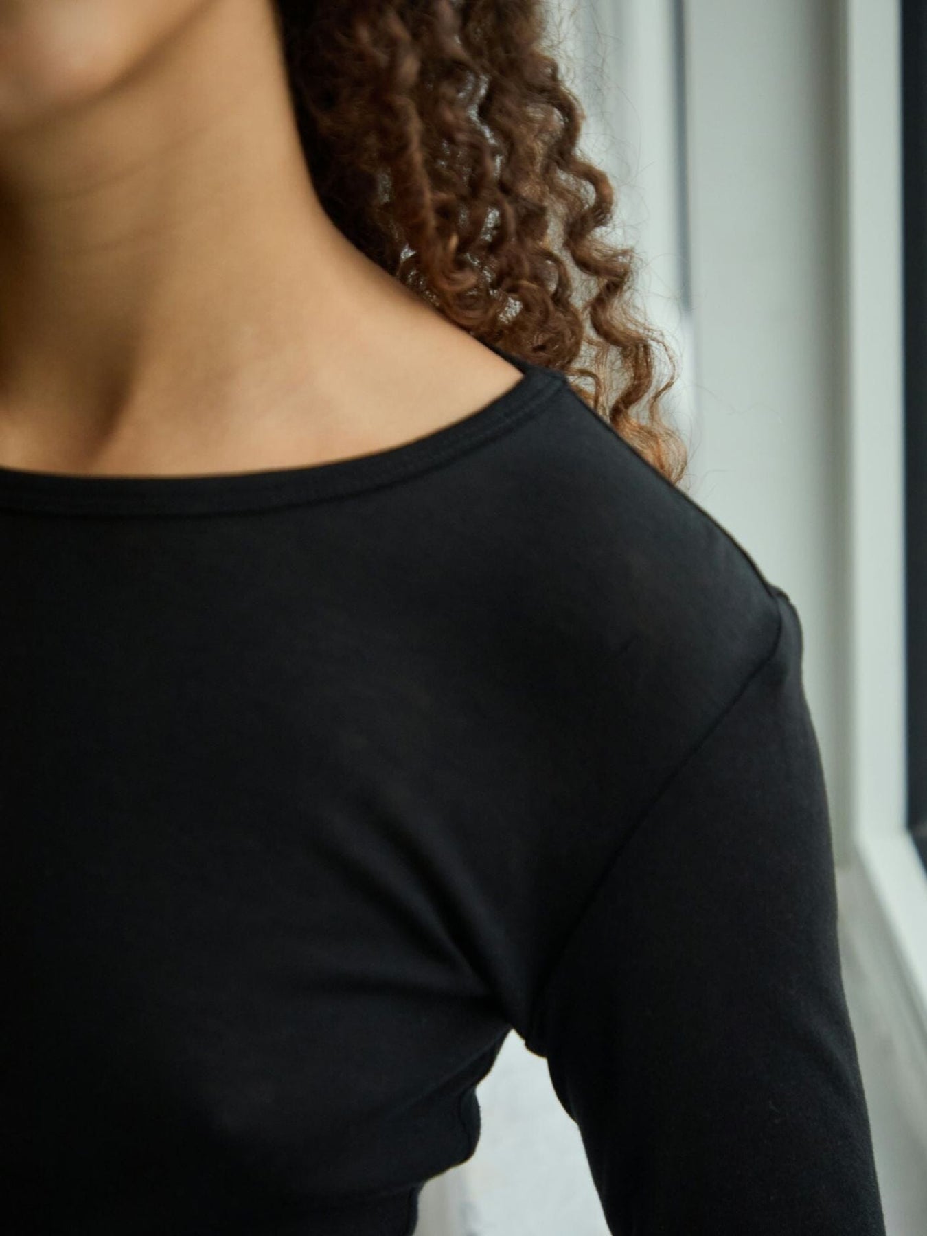 Sort ribbestrikket bluse fra Neo Noir i en myk blanding av lyocell og ull. Blusen har en tettsittende passform med lange ermer og rund halsutskjæring.