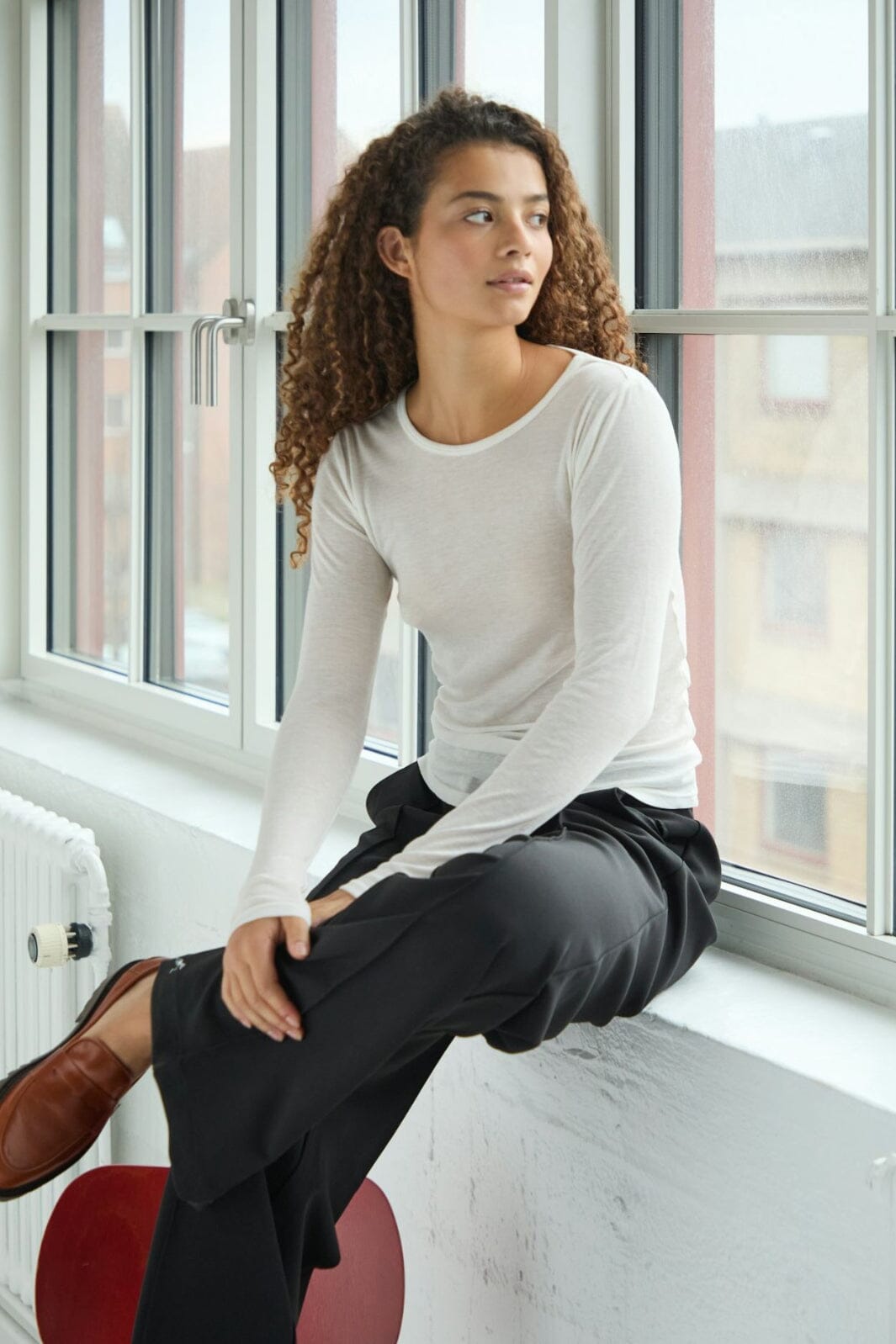 Hvit ribbestrikket bluse fra Neo Noir med rund hals og lange ermer. Blusen har en tettsittende passform og er laget av en myk og lett ribbestrikket kvalitet.