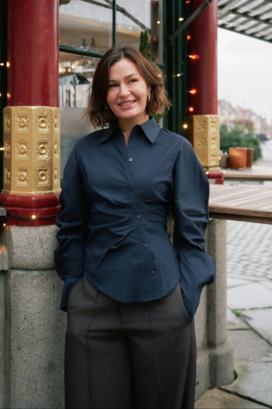 Mørkeblå skjorte fra Neo Noir med asymmetrisk knappelukking foran. Skjorten har en slim fit-passform og rynkede detaljer ved midjen samt lange ermer med puff.