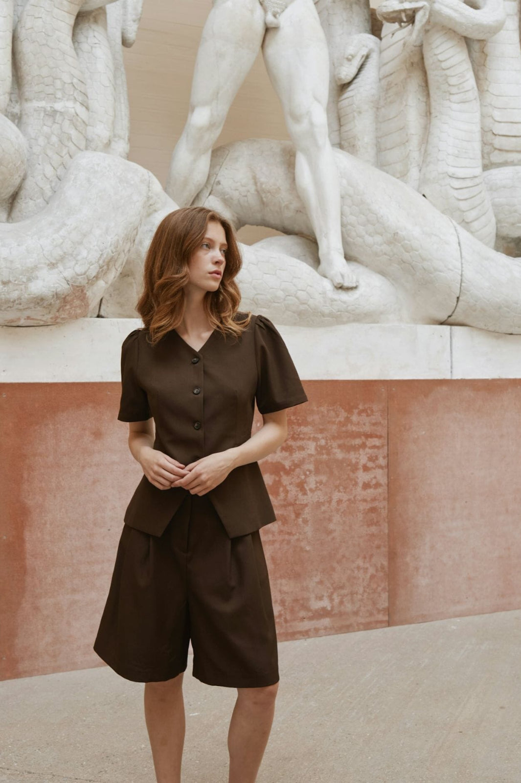 Mørkebrune shorts fra Neo Noir med brede ben og legg foran. Shortsene har en høy midje og en løs passform, som gir god bevegelsesfrihet.