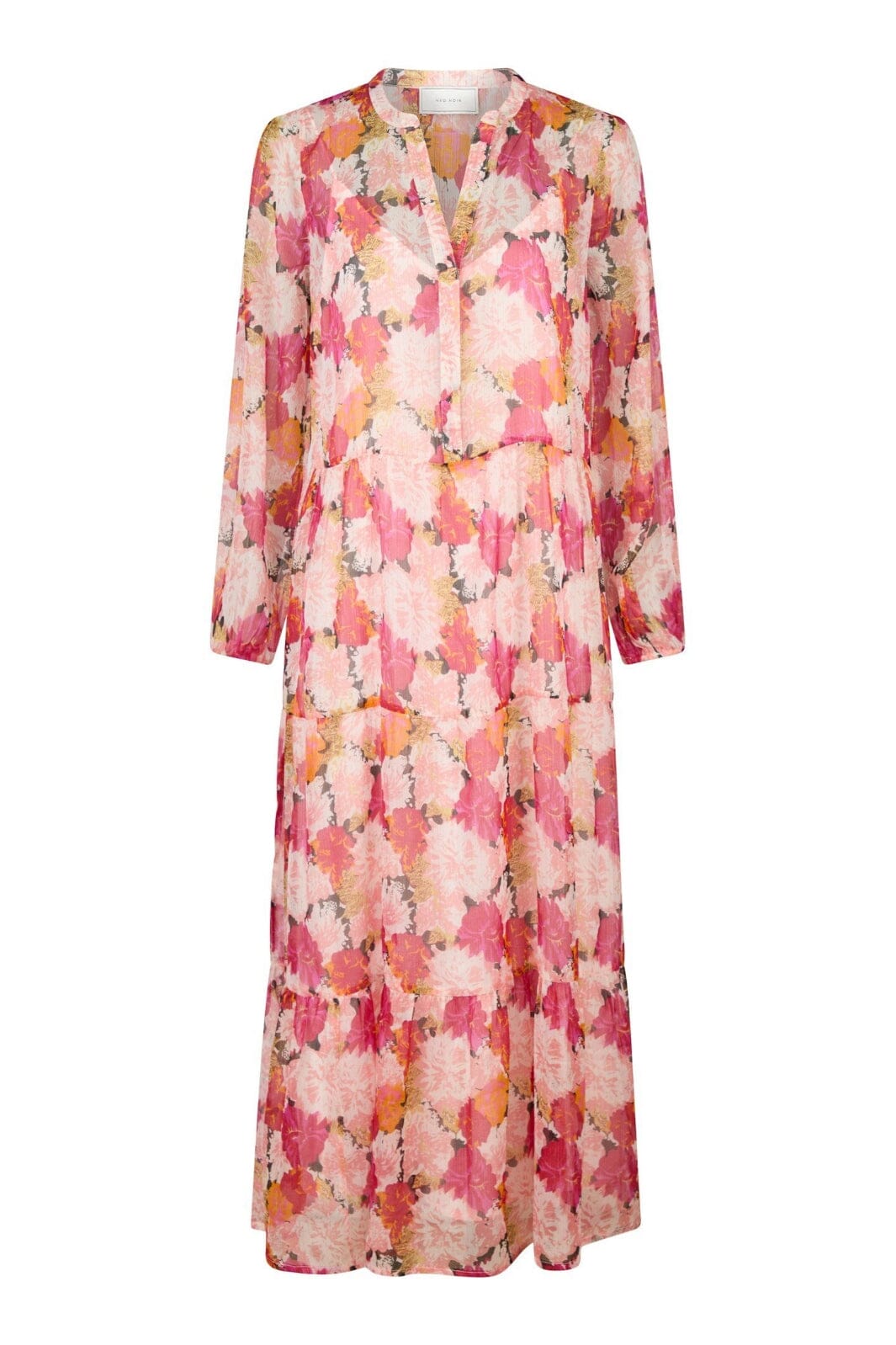 Lang kjole fra Neo Noir med blomsterprint i rosa og oransje nyanser. Kjolen har volanger i bunnen og 3/4-ermer med rund hals. Den semi-løse passformen gir god bevegelsesfrihet.