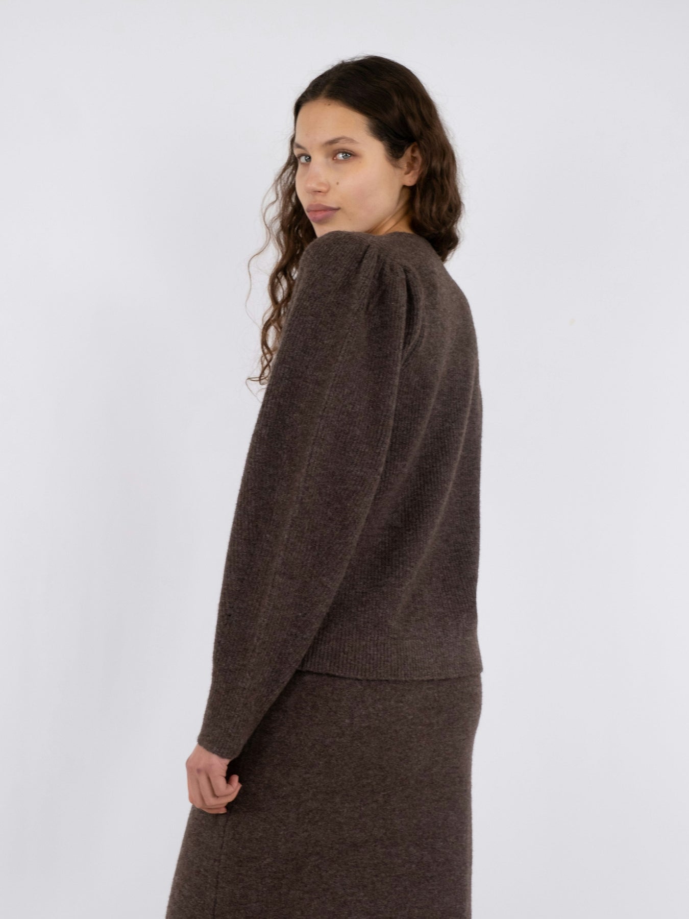 Brun melert cardigan fra Neo Noir i en myk strikket kvalitet. Den har rund halsutringning og perlemorknapper på forsiden. Cardiganen er laget med en semi-løs passform.