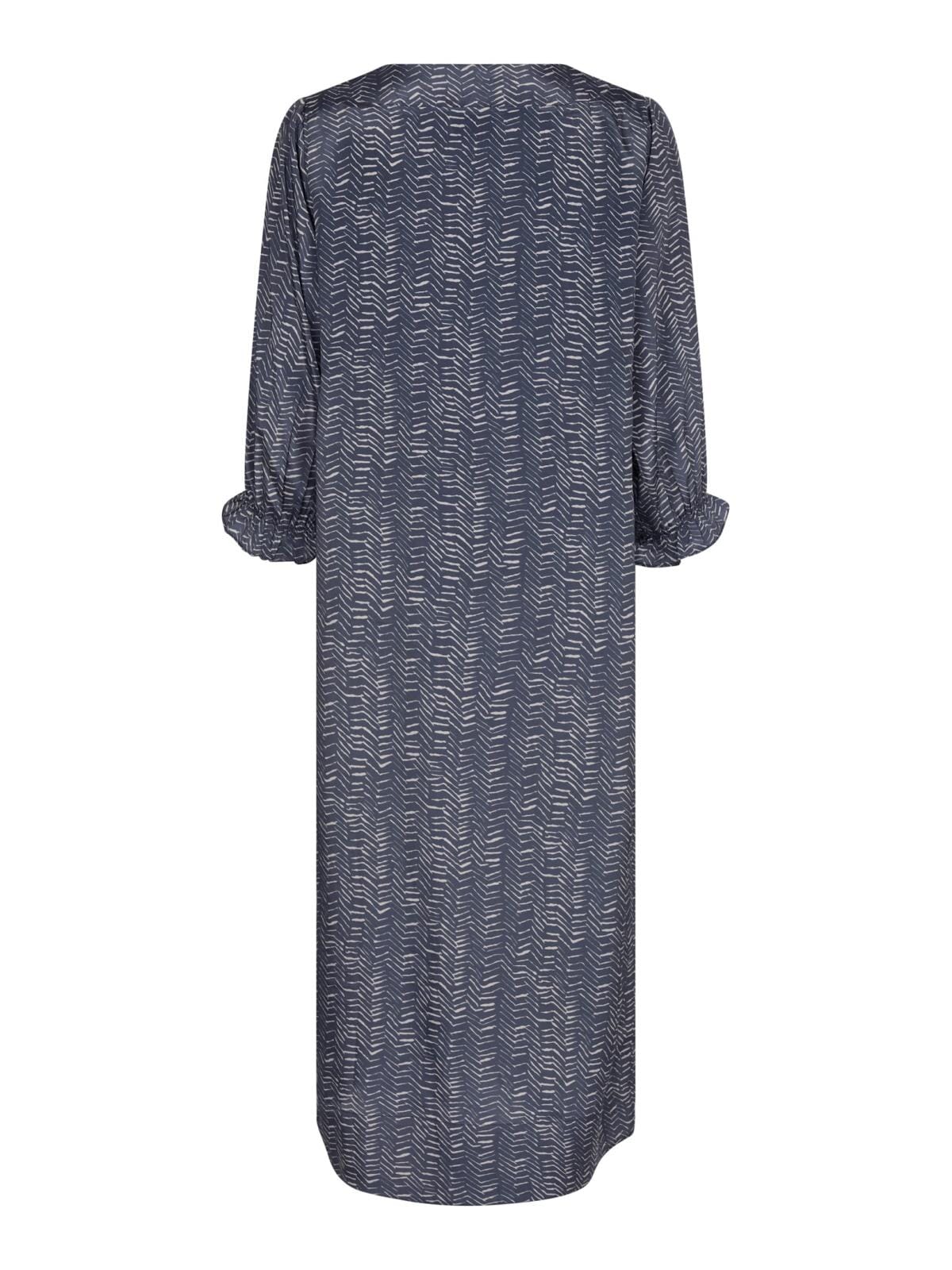 Mørkeblå kjole fra Neo Noir med zigzag-mønster. Kjolen har trekvartlange ermer med puff og en V-utskjæring. Den går til midten av leggen.