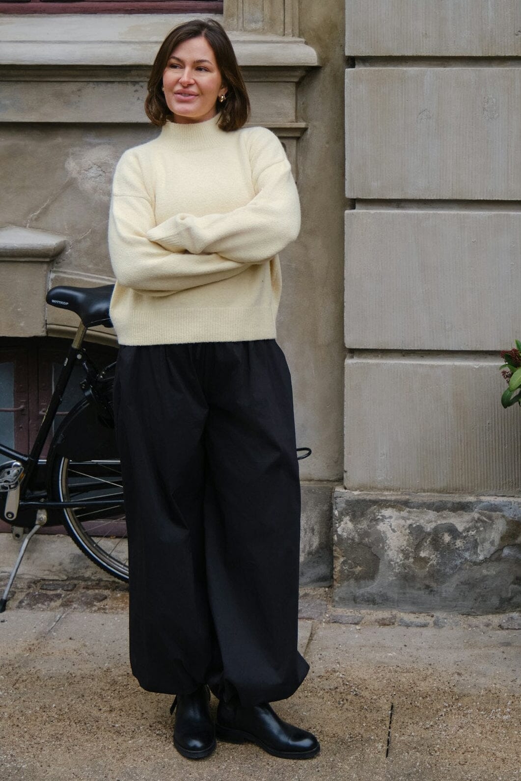 Smørgul strikkebluse fra Neo Noir med høy hals og lange ermer. Blusen har en løs passform og er laget av en blanding av polyester, akryl, ull og elastan.