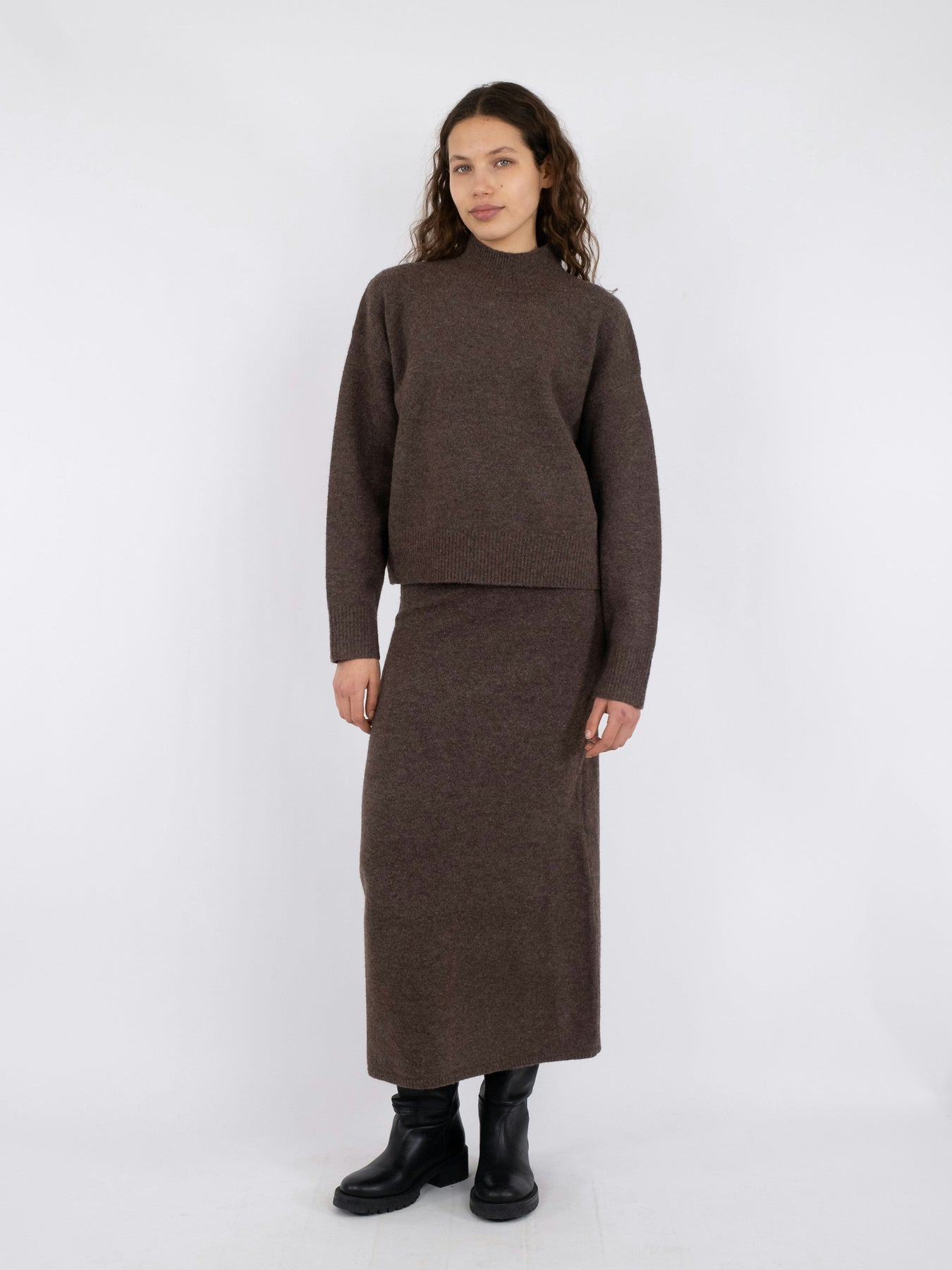 Brun melert strikkegenser fra Neo Noir med høy hals. Genseren har en løs passform og lange ermer. Materialet er mykt og holder godt på varmen.