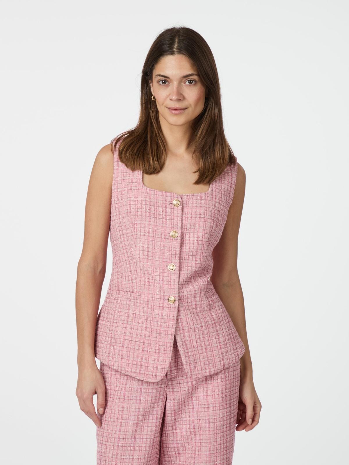 Lys rosa vest fra Neo Noir i bouclé-stoff med firkantet halsutskjæring. Vesten har fire gullknapper foran og en figursydd form som gir den et rent og stilrent uttrykk.