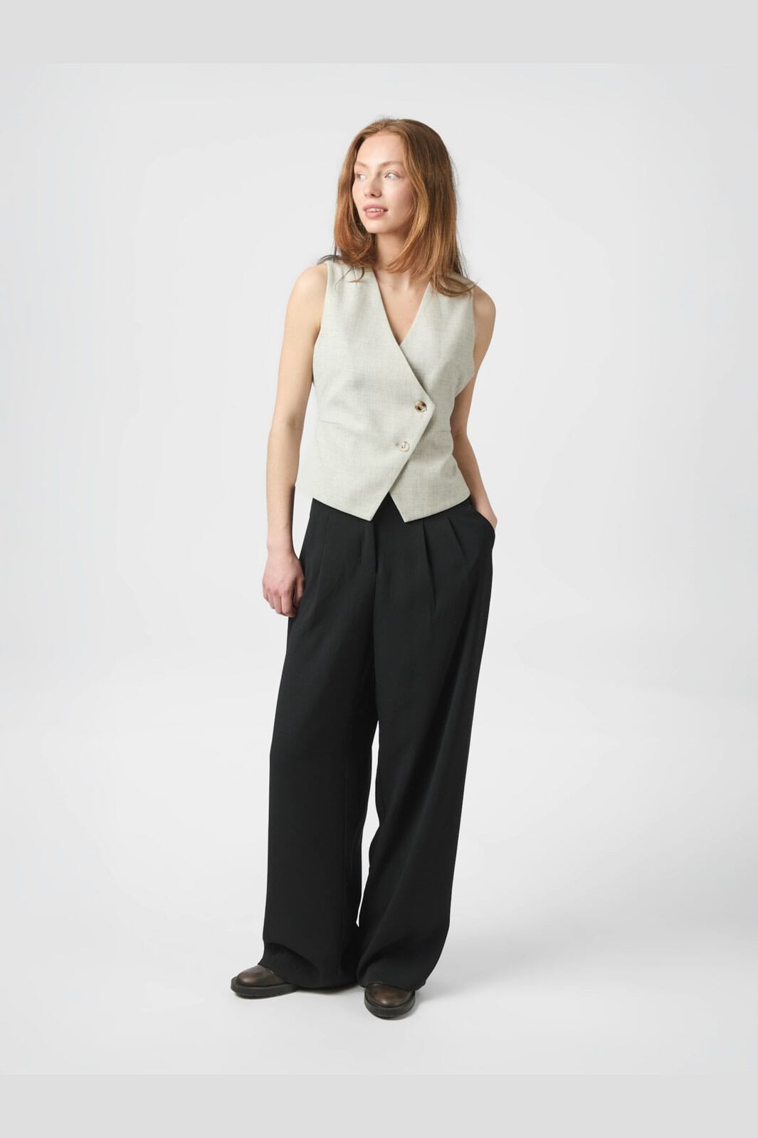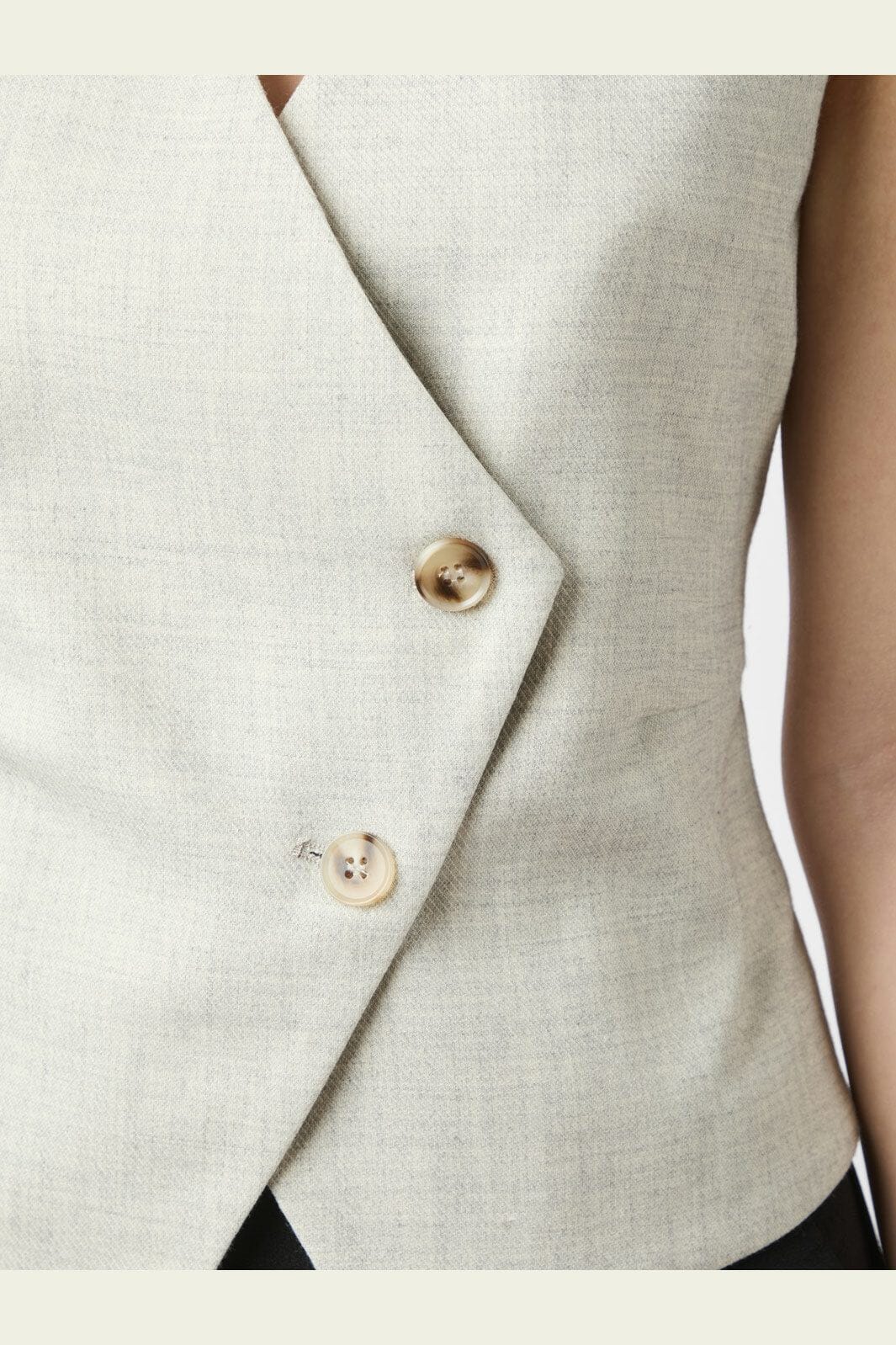 Flott tettsittende vest med en omslag som krysser over til siden. Den har også to knapper i fronten. Modellen er 176 cm og har på seg størrelse 36.