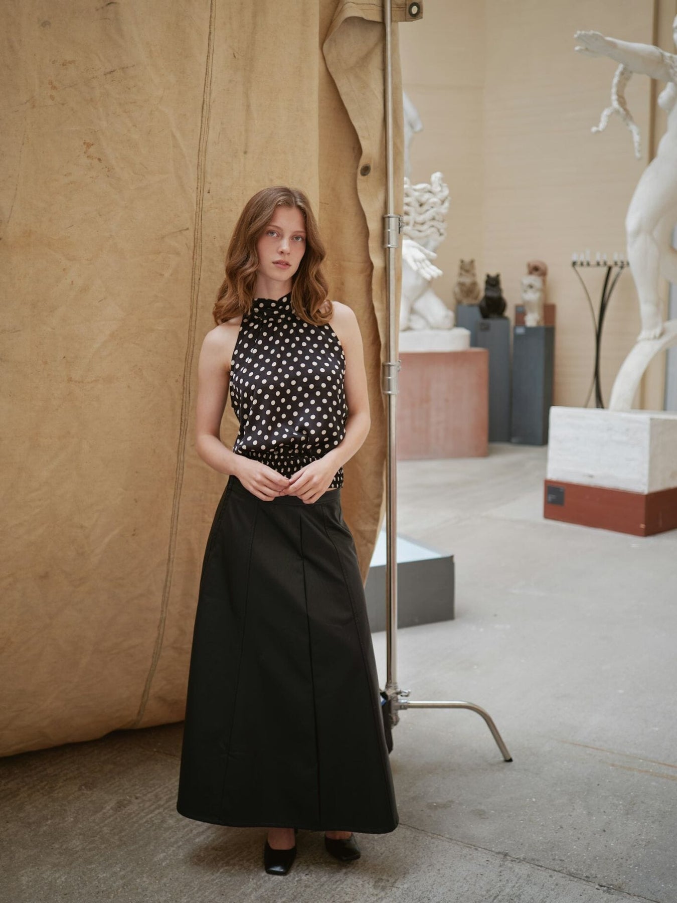 Svart skjørt fra Neo Noir i imitert skinn. Det A-formede skjørtet har en høy midje og rekker til anklene.