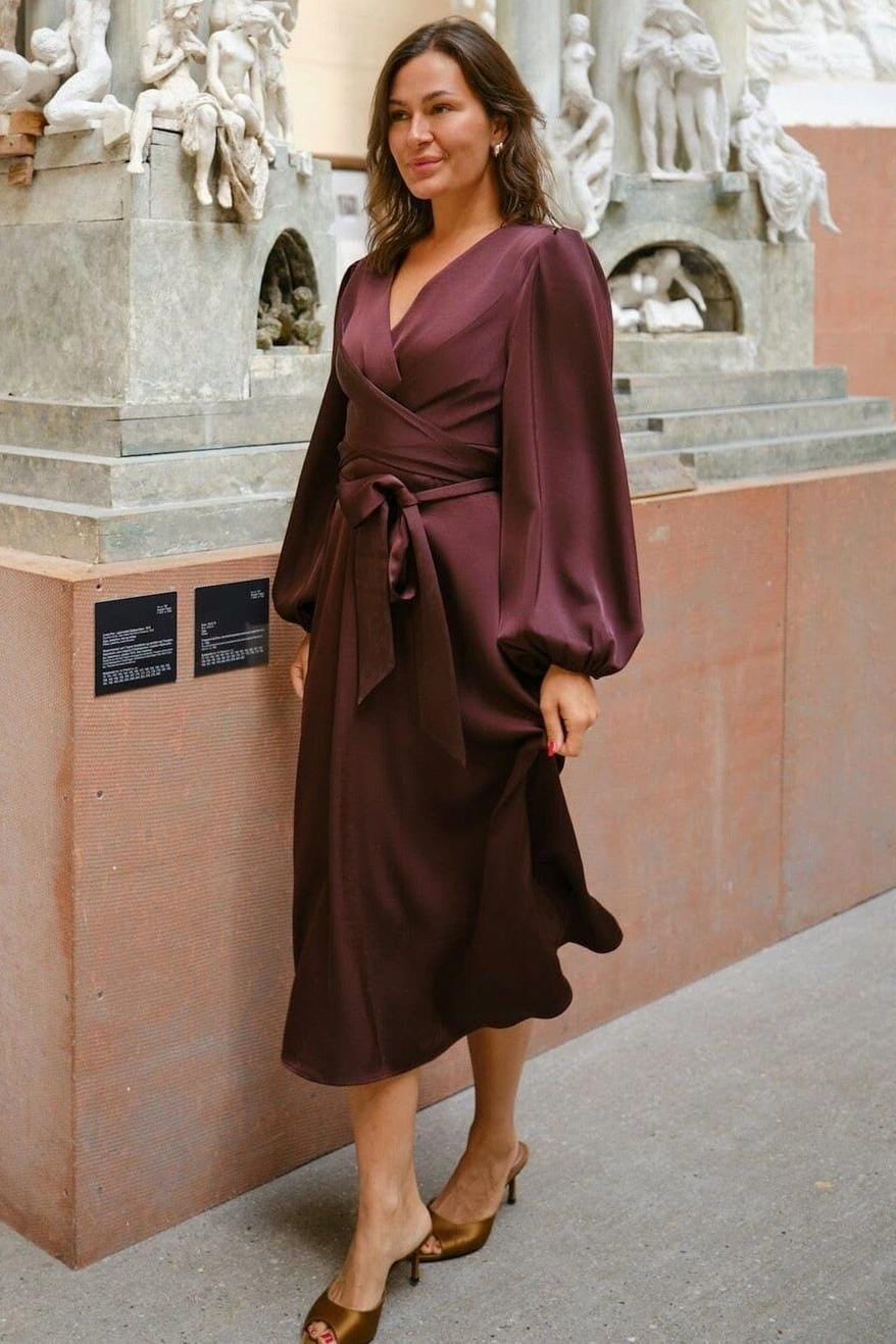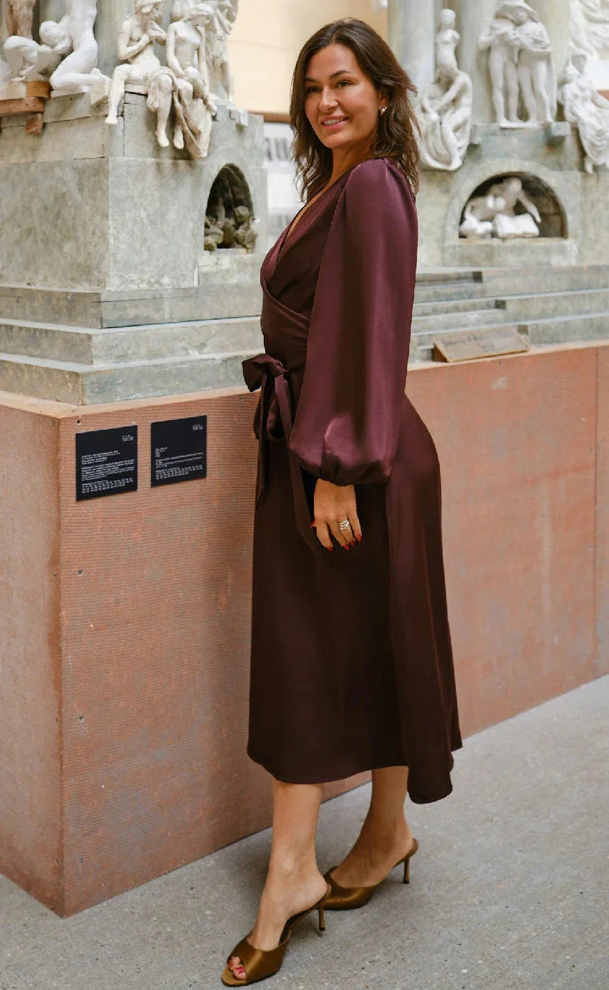 Satin kjole fra Neo Noir i mørk rosa. Kjolen har en V-utringning, lange ermer med samlede håndledd og et omslagsdesign med knytebånd i midjen.