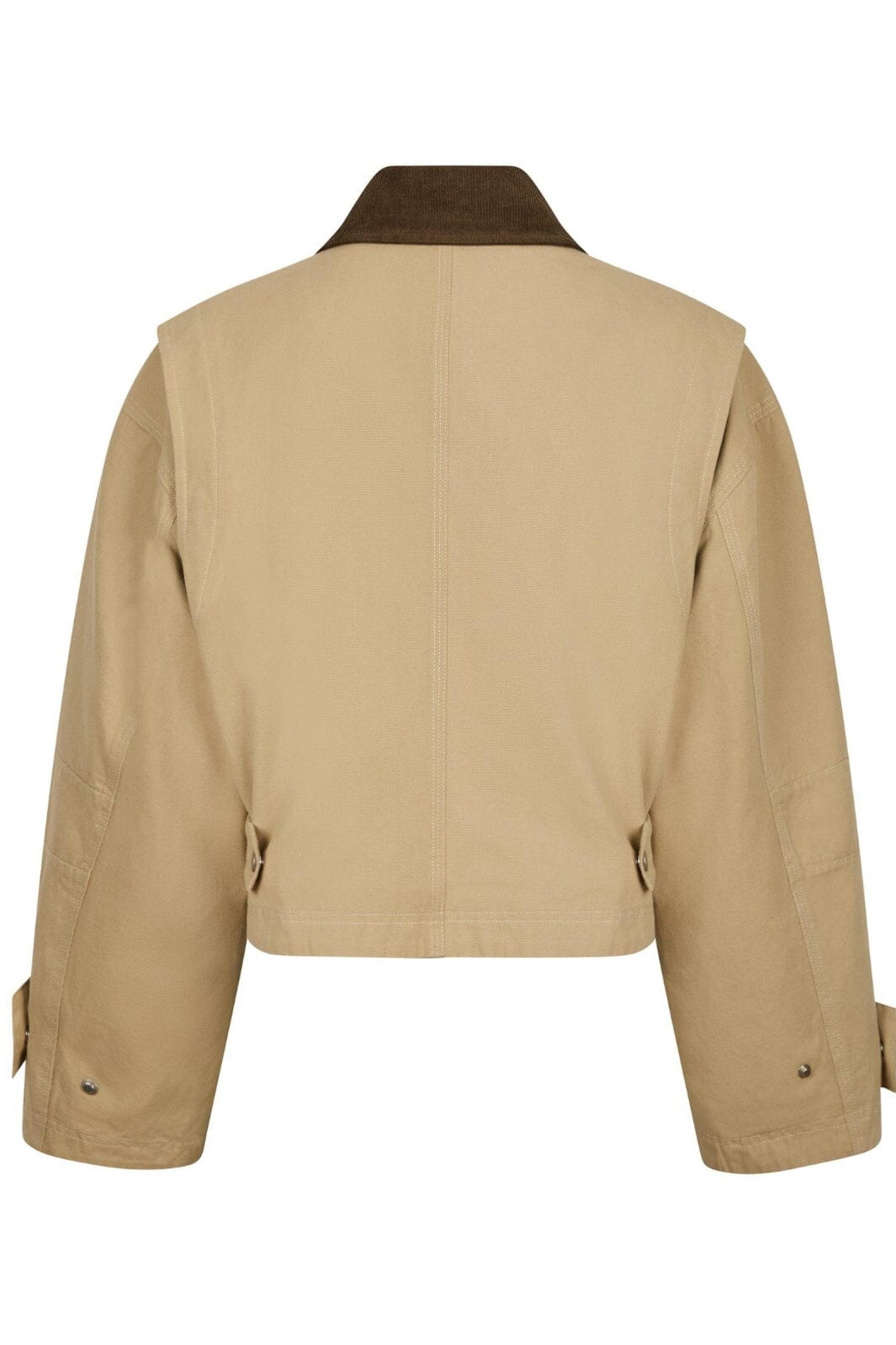 Canvasjakke fra Neo Noir i sandfarget bomull. Den boxy modellen har en mørkebrun kordkrage, to store lommer foran samt glidelås og trykknapper til lukking.