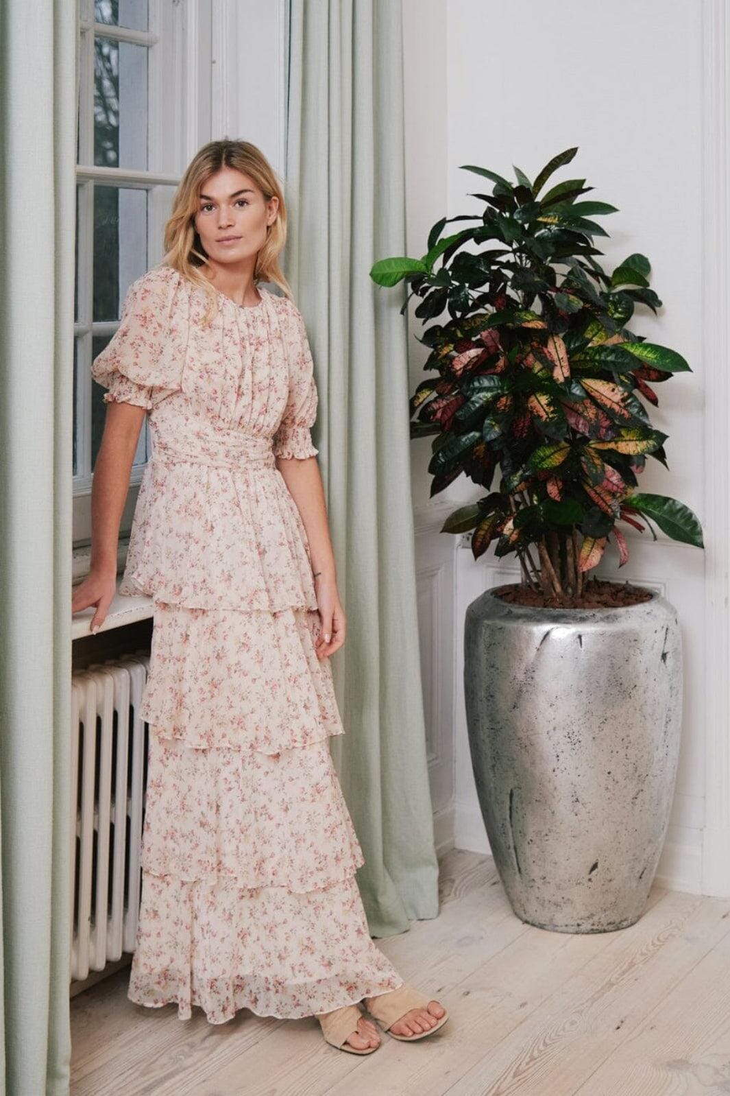 Kjole fra Neo Noir i krem med blomsterprint. Kjolen er laget av polyester og har ankellang lengde med flere lag i underdelen.