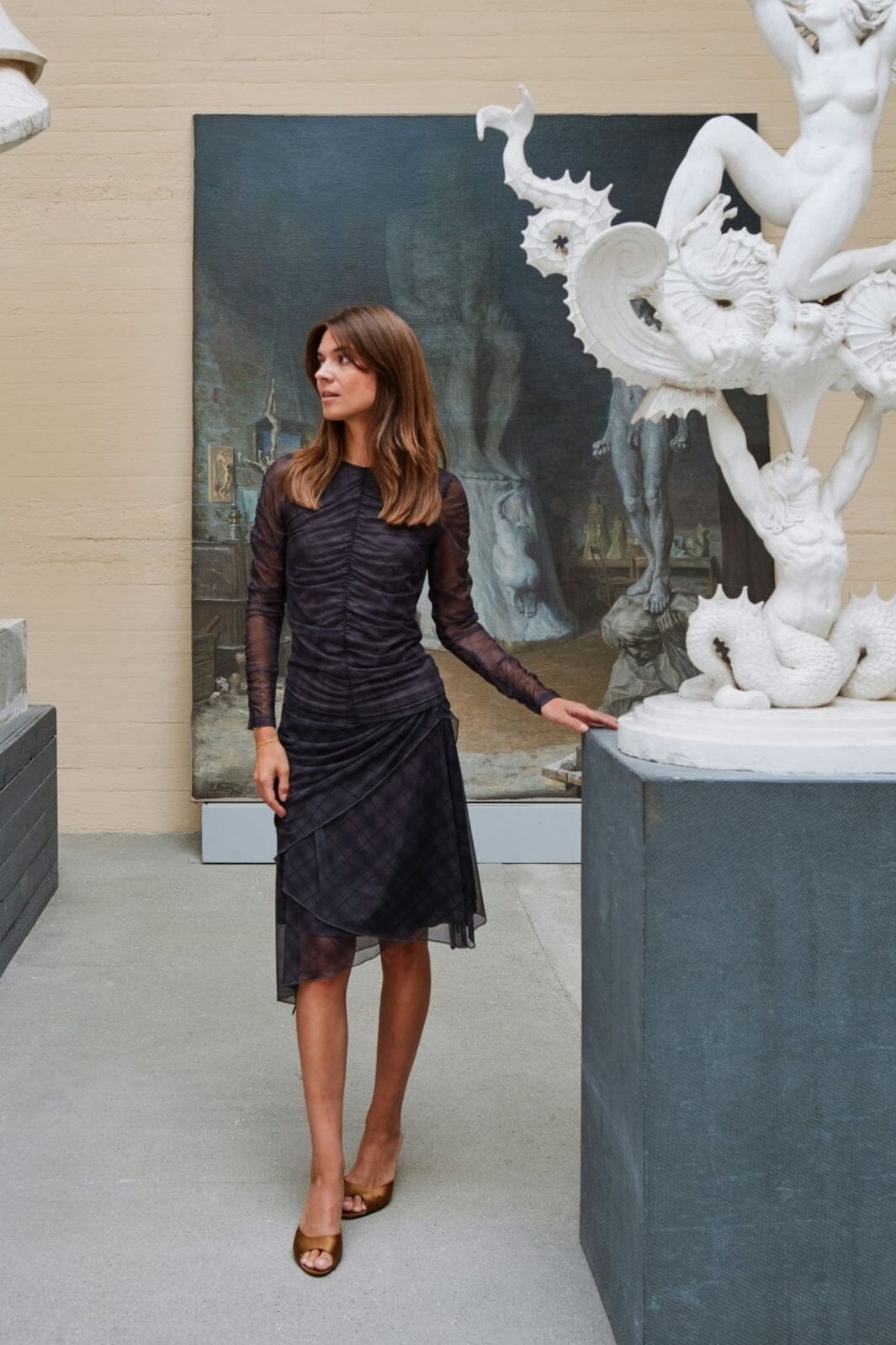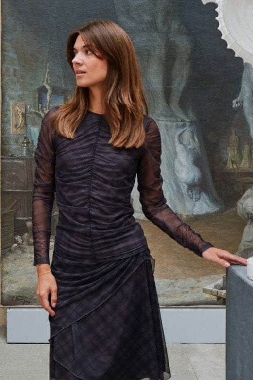 Mørkegrå mesh-skjørt fra Neo Noir med rutete mønster. Det asymmetriske skjørtet har et drapert design med volanger og rysjer, som gir et mykt fall.