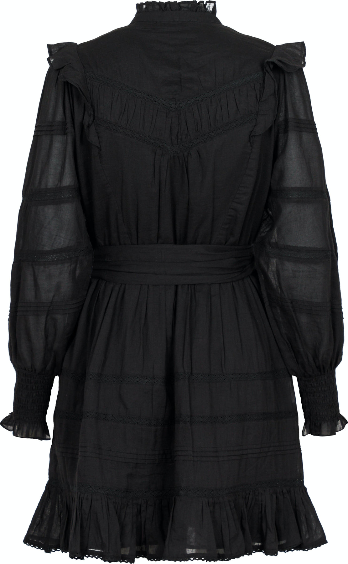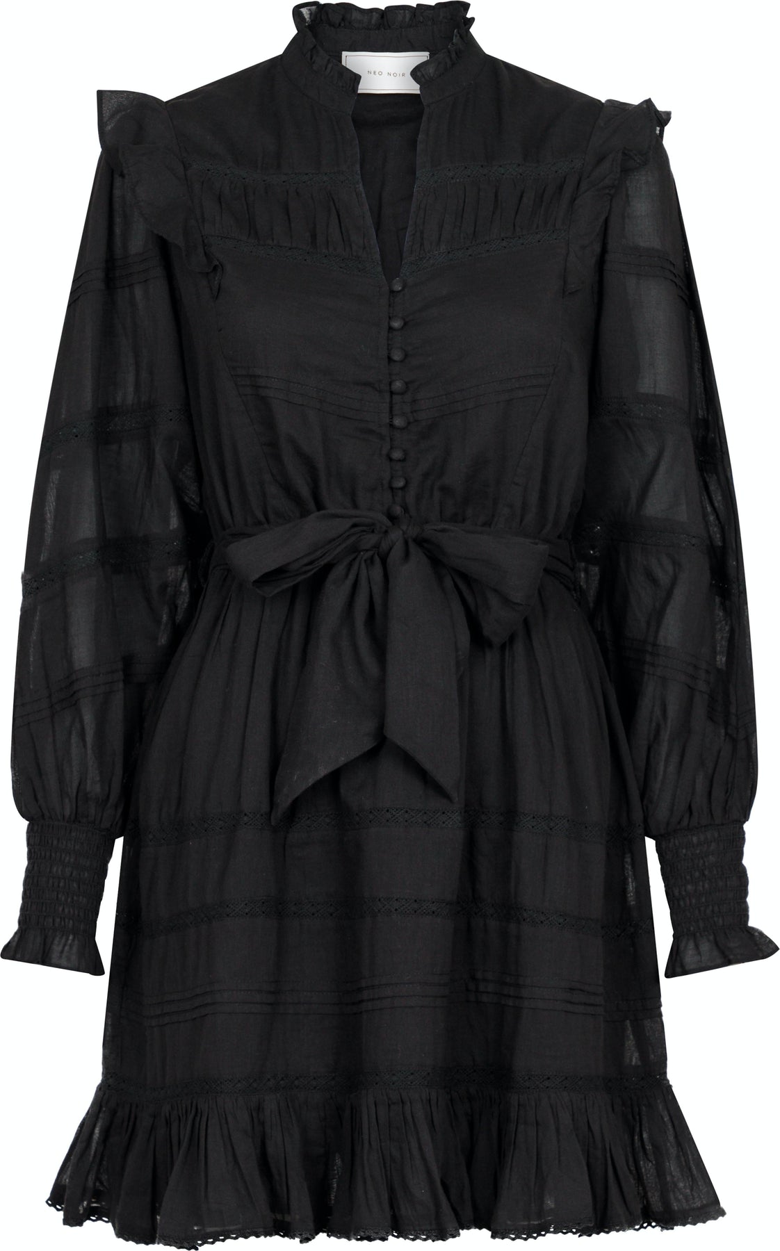 Svart voilekjole fra Neo Noir i myk bomull. Kjolen har volanger, knapper foran og bånd i midjen. De lange ermene har elastiske mansjetter.