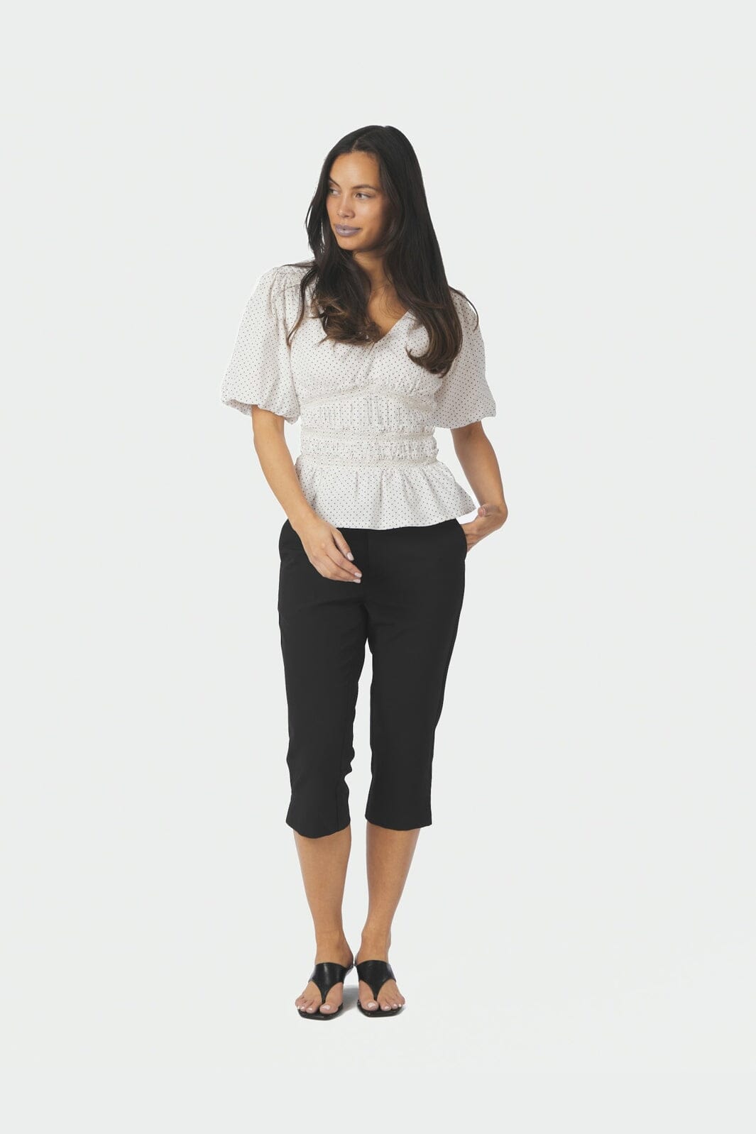 Hvit bluse fra Neo Noir med små svarte prikker. Blusen har korte ermer og en V-utringning med smock i midjen.