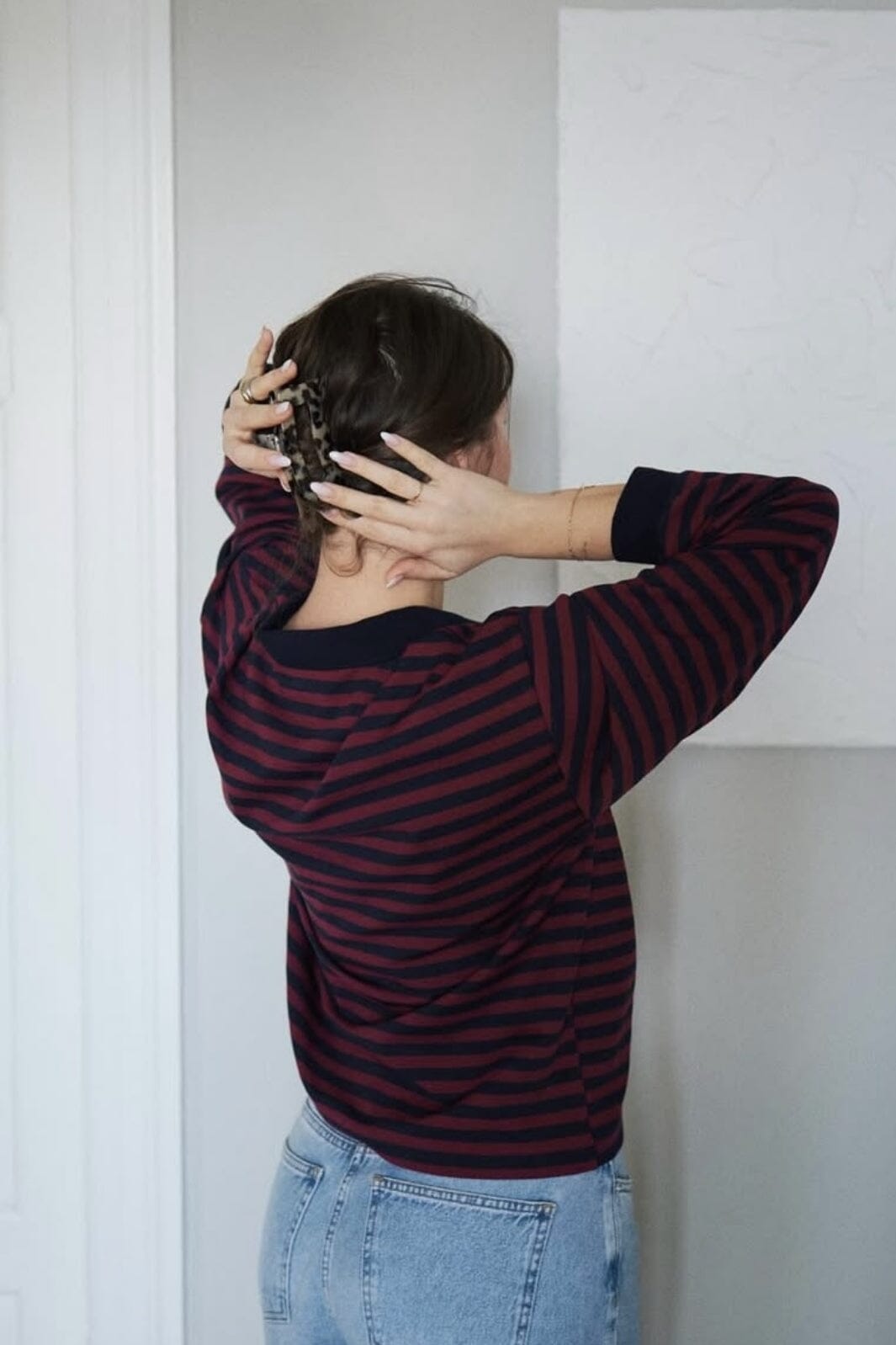 Stripet polotrøye fra Neo Noir i mørkeblå med brede burgunderstriper. Trøya har en polokrage med knappelukking og lange ermer med ribbekant ved håndleddene.
