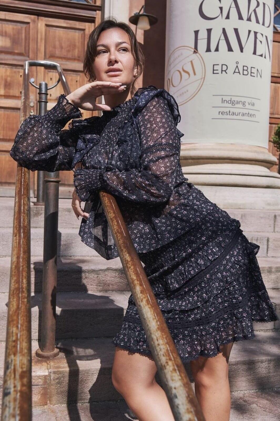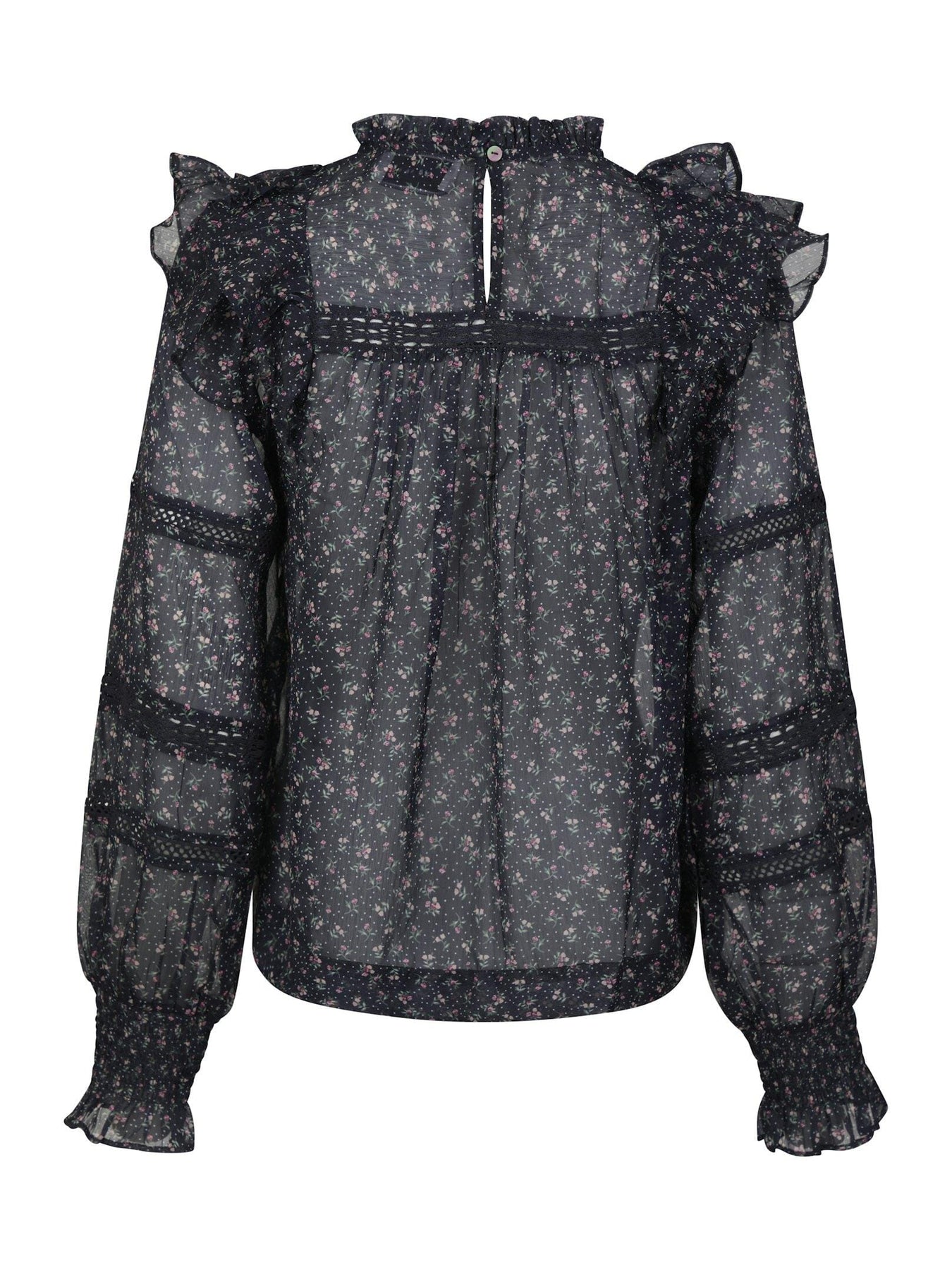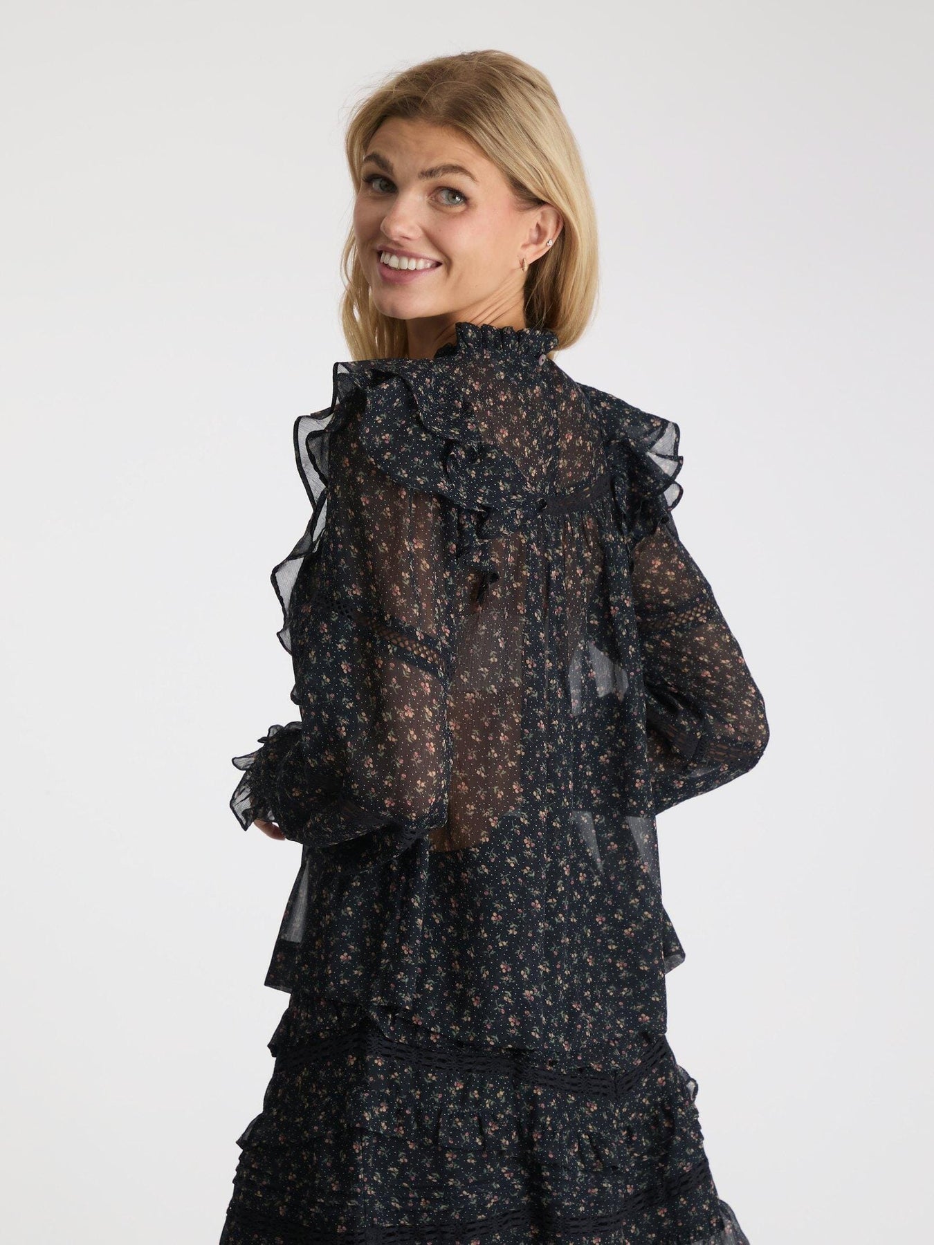Svart bluse med blomsterdesign fra Neo Noir. Blusen har en løs passform med høy hals og volangdetaljer. Stoffet er lett gjennomsiktig med et fint blomsterdesign.