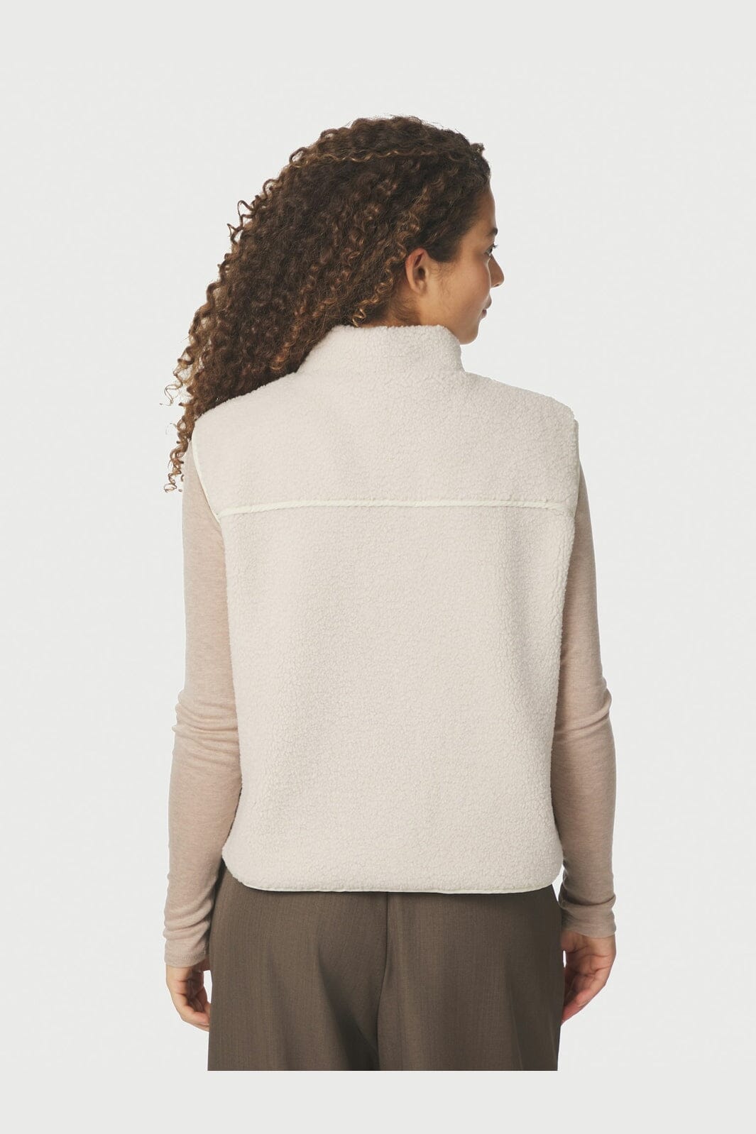 Ermeløs vest fra Neo Noir i myk teddy-kvalitet og lys elfenbensfarge. Vesten passer til avslappede og hjemmekoselige omgivelser med to store frontlommer.