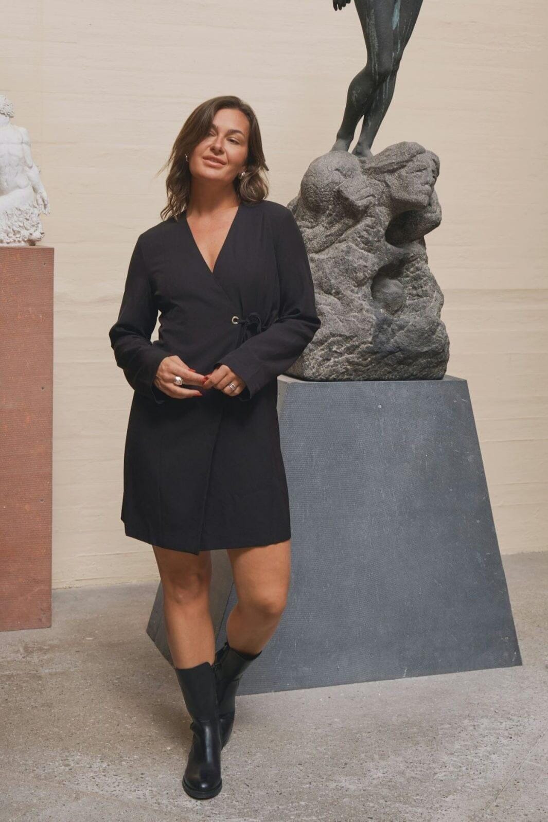 Sort omslagskjole fra Neo Noir med V-halsutskjæring og 3/4 ermer. Kjolen har snøredetaljer med metallring i siden, som gir mulighet for å justere passformen.
