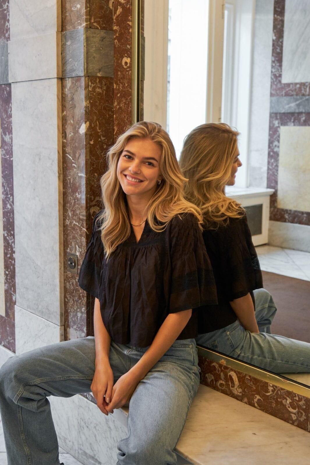 Sort voile-bluse fra Neo Noir med løs passform. Blusen har bånddetaljer og små legg ved halsutskjæringen samt brede 3/4-ærmer som stopper rett over albuen.