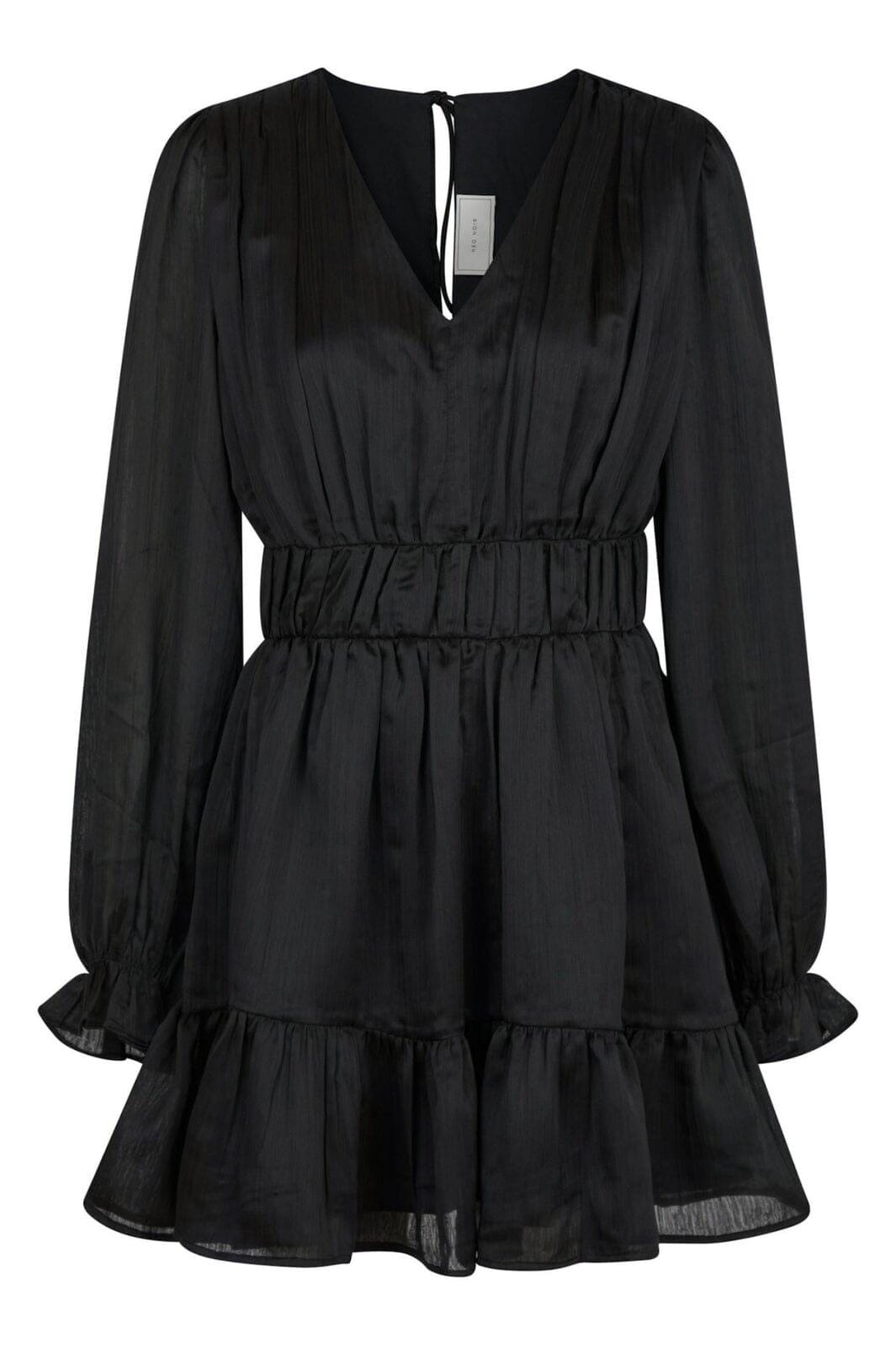 Svart kjole fra Neo Noir med v-hals og lange ermer. Kjolen har en samlet midje med volangkant og bindebånd som gir den et feminint uttrykk.