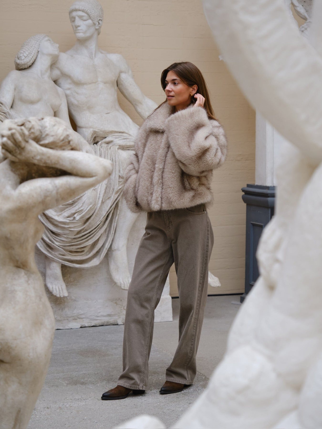 Supermyk jakke i imitert pels med en løs, oversized passform. Jakken har en cropped passform. Modellen er 176 cm høy og har på seg størrelse 36.